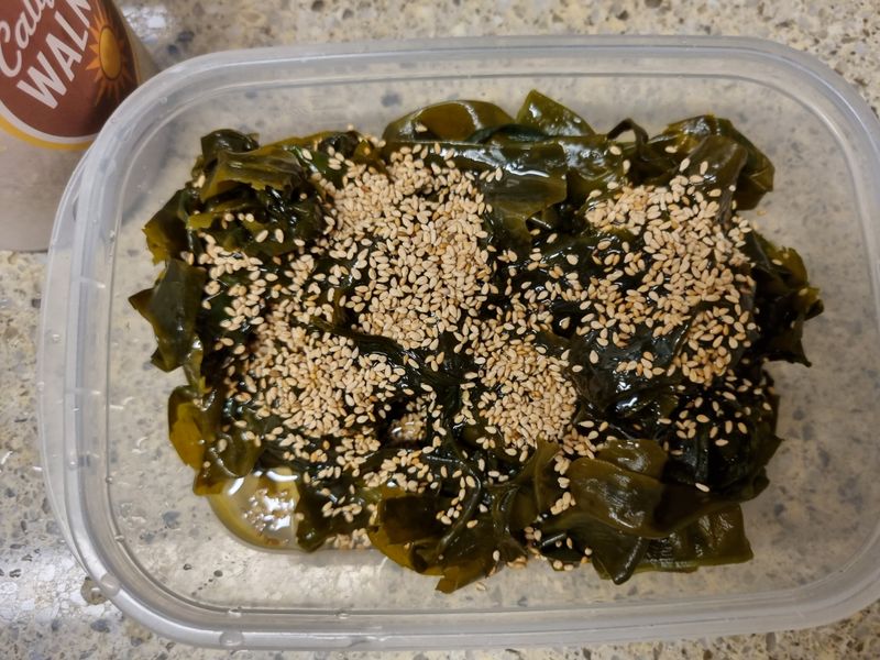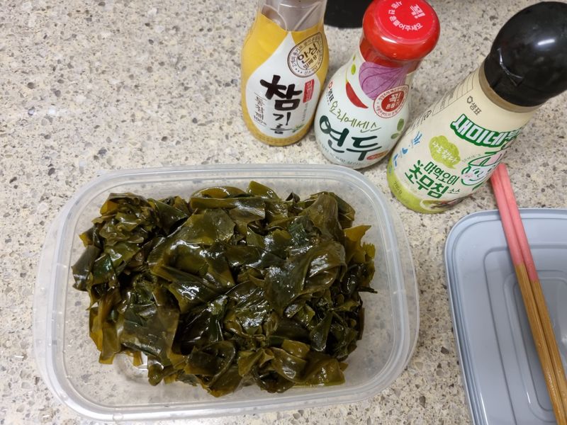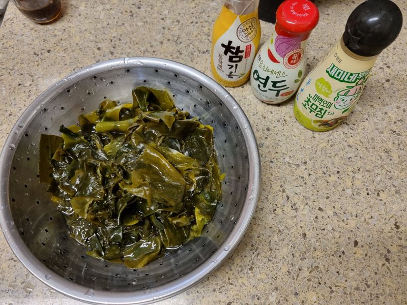 건미역을 물에 불린 후 미역을 자르고 물에 소금, 식초를 넣고 살짝 데친 후. 찬물에 헹군 후 새미네 미역초무침 6T, 참기름 1T, 통깨를 넣어 미역초무침을 만들었는데 깜빡하고 찬물에 헹군 후 물기를 짜지않아서.양념을 다 한 후 물기를 짜버렸다는... 이렇게 간단한 새미네부엌을 순서를 제대로 하지않아서 망했어요ㅜ 요리똥손 어떻게 할까요