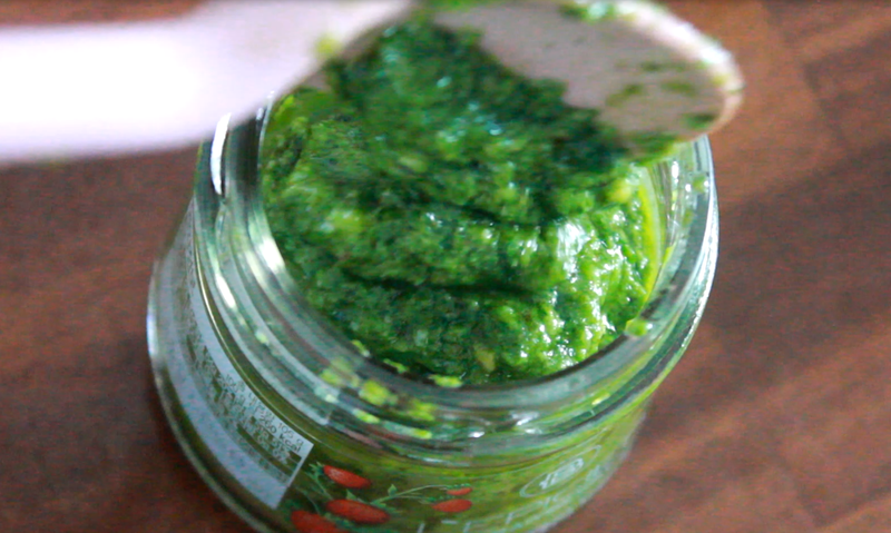 바질페스토는 바질과 견과류, 올리브유, 치즈를 넣고 믹서에 갈아 만들었어요