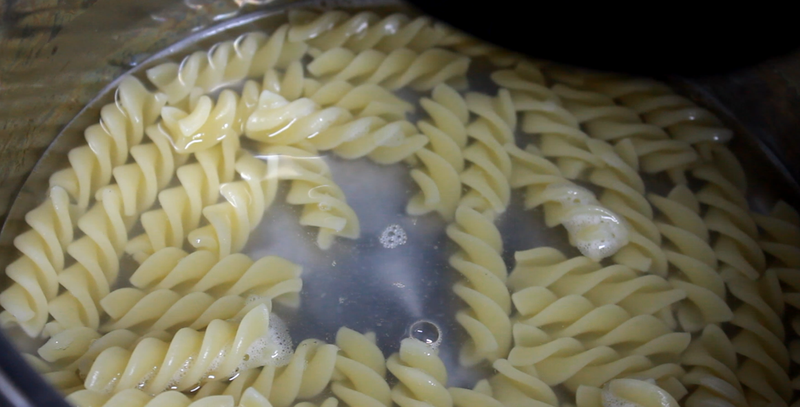 재료를 볶은 팬에 삶은 푸실리를 넣고 볶아주고 소금간을 합니다
