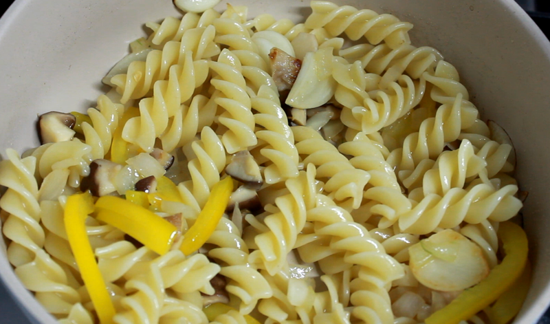 푸실리는 삶아서 익혀주고 팬에 올리브유를 두른 후 편마늘, 다진양파, 파프리카, 새송이 버섯을 넣고 볶아줍니다.