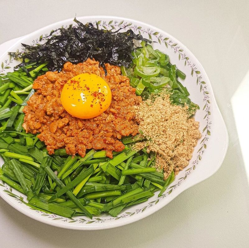 4. 물기 뺀 면 위에 볶은 닭가슴살, 고명, 노른자 올리시면 완성입니다 😊 맛있게 비벼드세요 👍