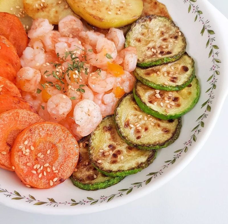 ✅ 새우야채구이 (소금간 X / 파인애플소스) 어제 손질해둔 애호박, 당근, 감자랑 새우 꺼내서 구워먹었어요 🥰 요즘 저염식단 도전중이라서 소금간은 안하고 파인애플 소스만 조금 뿌렸어요. 살짝 싱겁지만 이렇게 먹어도 맛있네요. 저염식단에 점점 익숙해지면 좋겠어요!