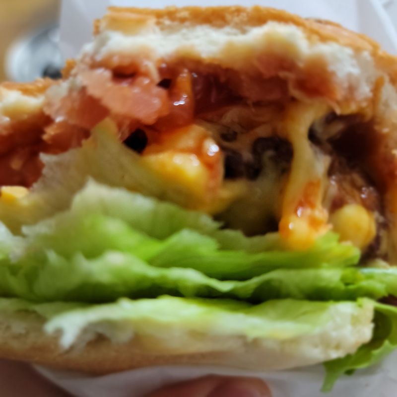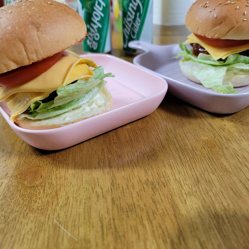 참깨빵 위에 양상추~ 함박스테이크 한장 치즈 토마토 양파까지~ 따라따따따