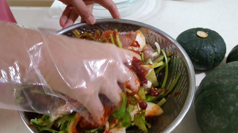 홍어에 채소를 썰어 넣고 고추장.고추가루.마늘.식초