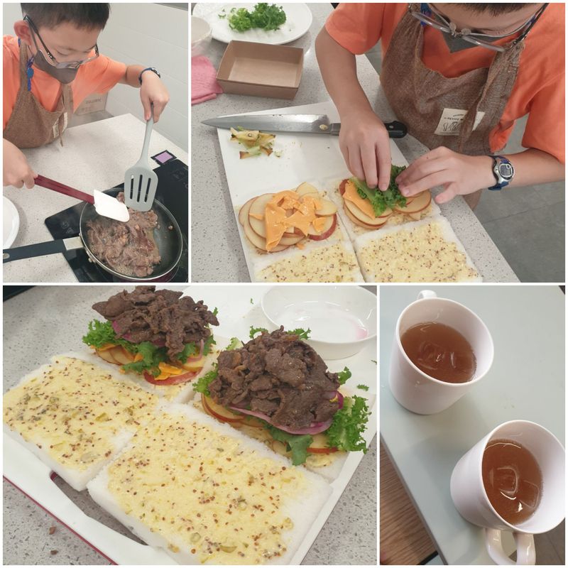 제가 만든 샌드위치는 빵이 없어요. 떡으로 만들었답니다. 엄마가 만들어주신 시원한 매실차와 마시니 꿀맛이에요.