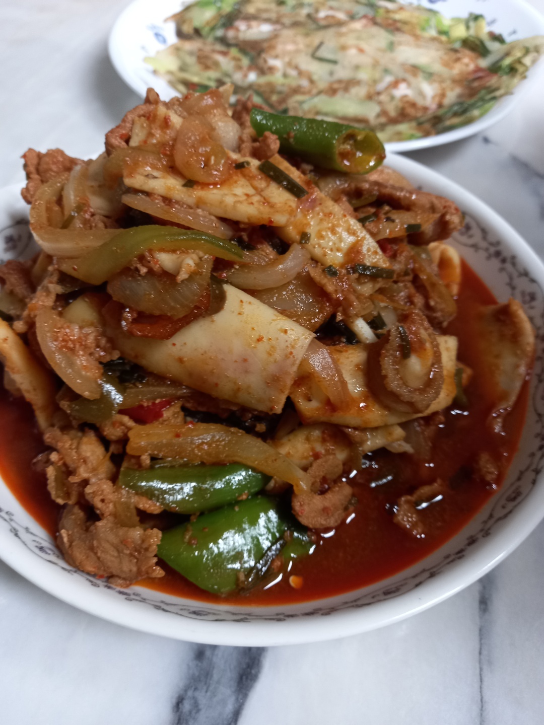 오징어야채파전과 오삼불고기 오징어 초장 찍먹하기