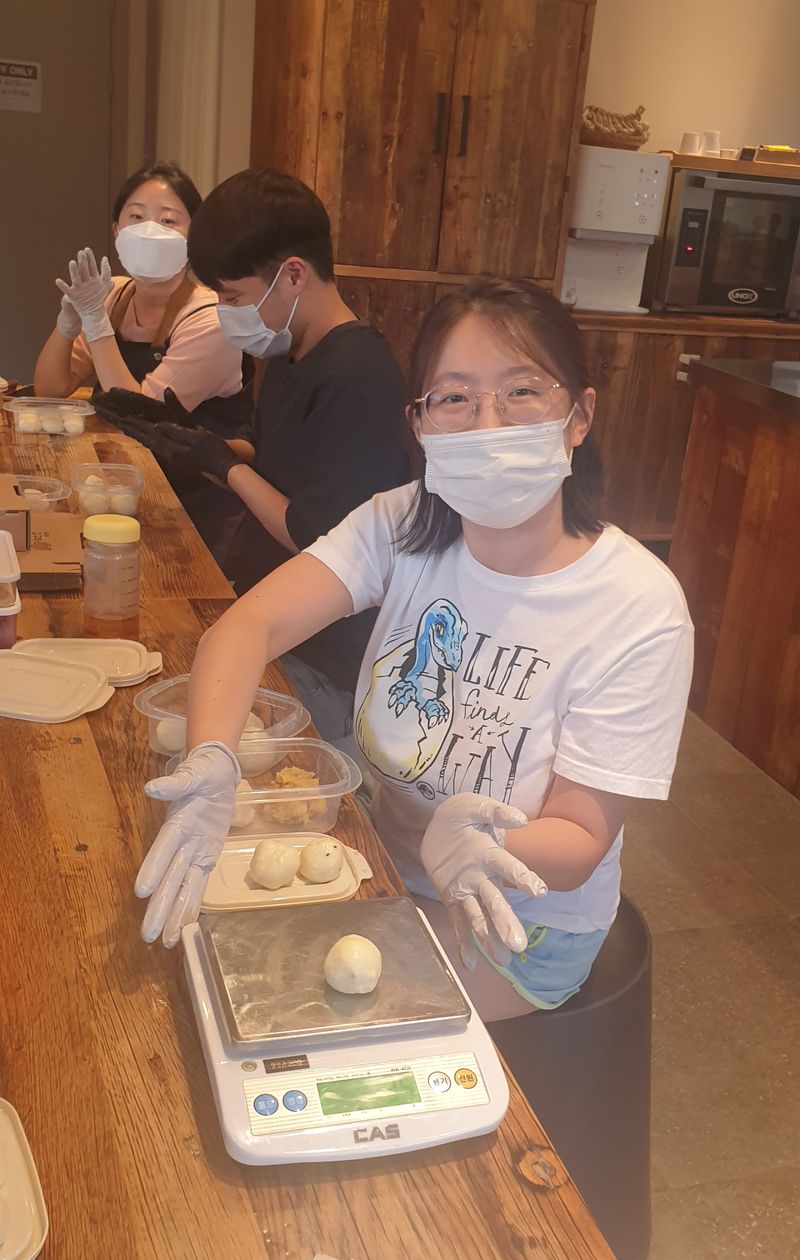 첫 미션은 반죽 210g을 정확히 6등분하기 ~ 오븐에서 설익거나 타지 않게 잘 구워지려면 같은 양으로 반죽을 나눠야 하죠 바로 35그램 맞춰서 대성공이라고 칭찬받았습니당^^