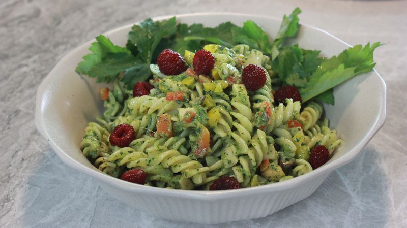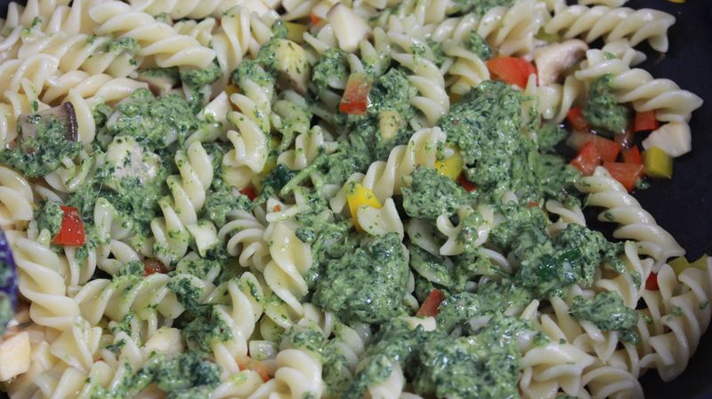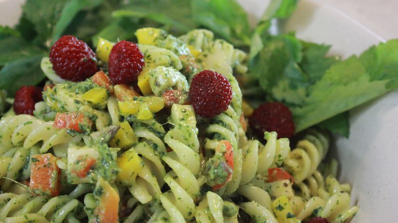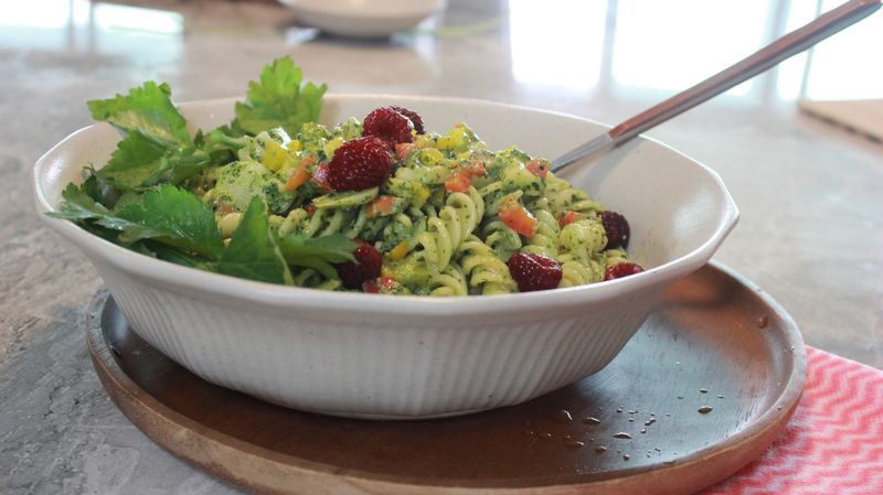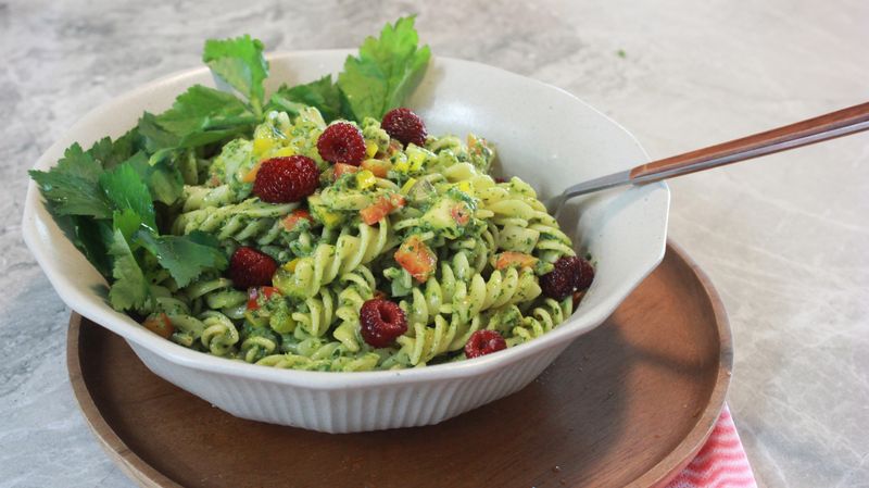 참나물 페스토를 만들어 익혀 놓은 푸실리 파스타에 넣고 섞어주었는데요