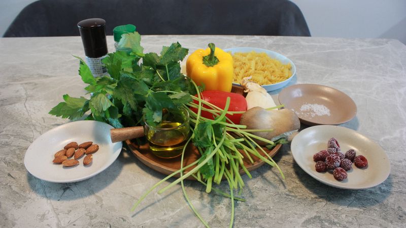 아몬드, 올리브유, 파프리카, 새송이버섯, 치즈 등을 넣어 만든