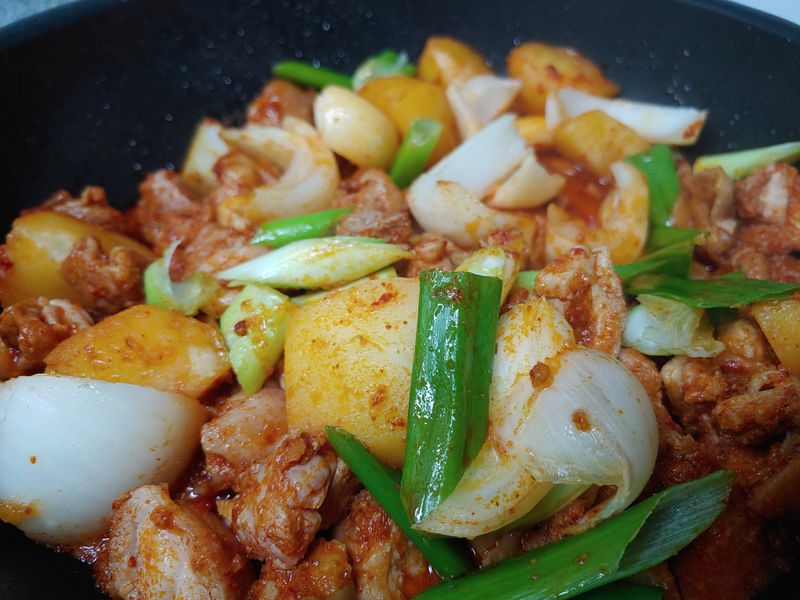 감자 대파 듬뿍 넣고 지글지글 닭갈비볶음 완전 맛있어요♡ 다 먹고 나서 꼭 김치 넣고 볶음밥까지 해먹네요. 네식구 푸짐하게 한끼 먹을수 있어서 자주 해먹는 것 같아요. 양념 : 샘표간장, 고추장, 고추가루, 후추, 설탕(올리고당)