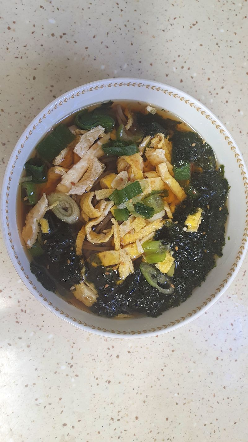 면삶고 쯔유에 물섞어서 끓인뒤 좋아하는 고명 올려먹으면 고소하고 너무 맛있어요