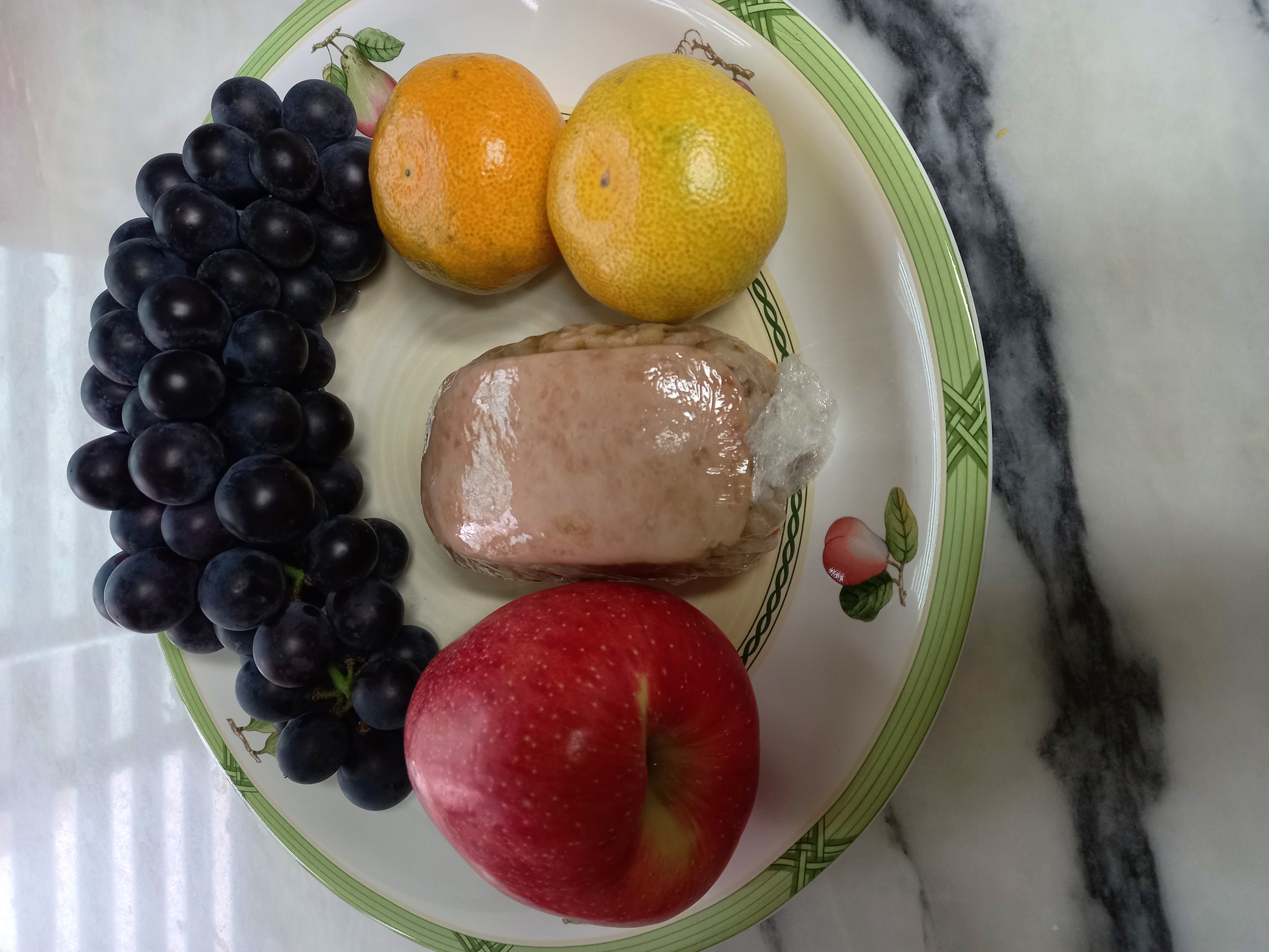 스팸무스비, 갈비, 분홍소시지,호박부침개,커피 .사과,귤,포도,복숭아 과일까지