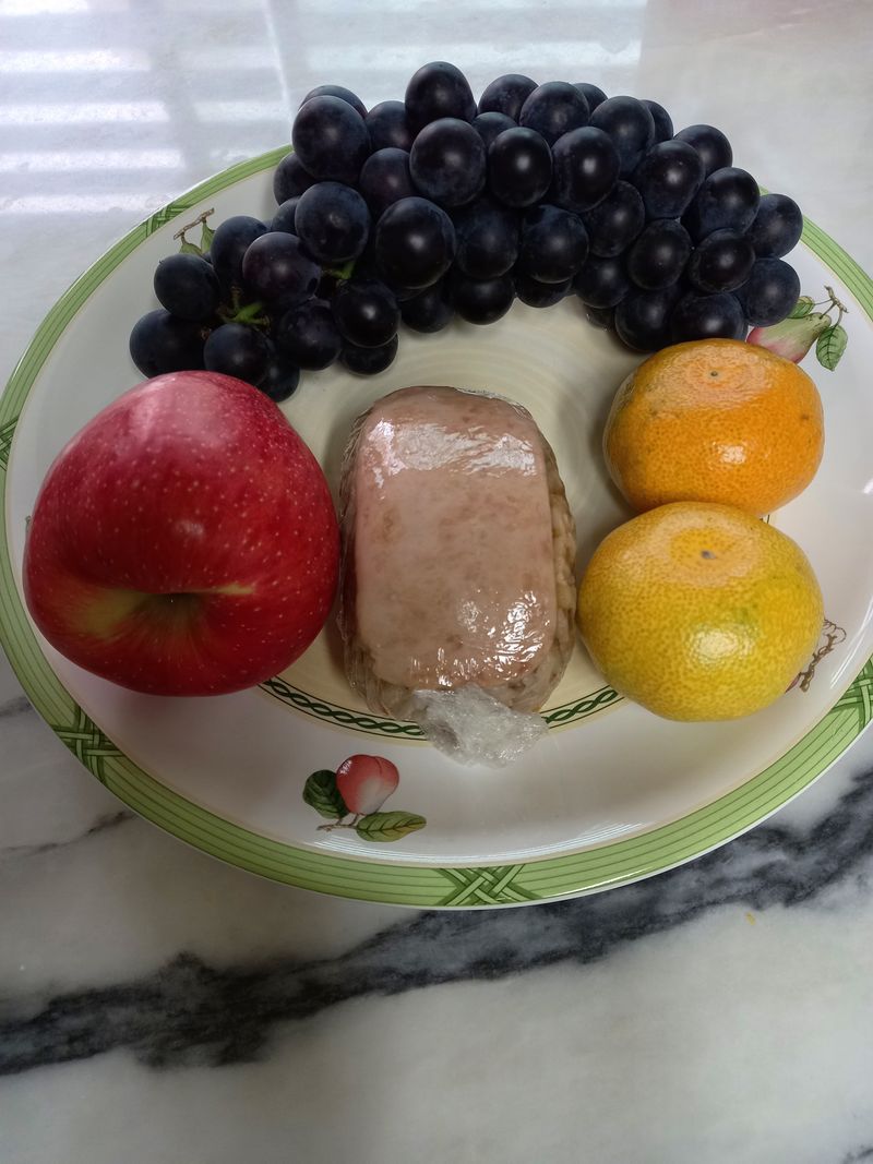 스팸무스비, 갈비, 분홍소시지,호박부침개,커피 .사과,귤,포도,복숭아 과일까지