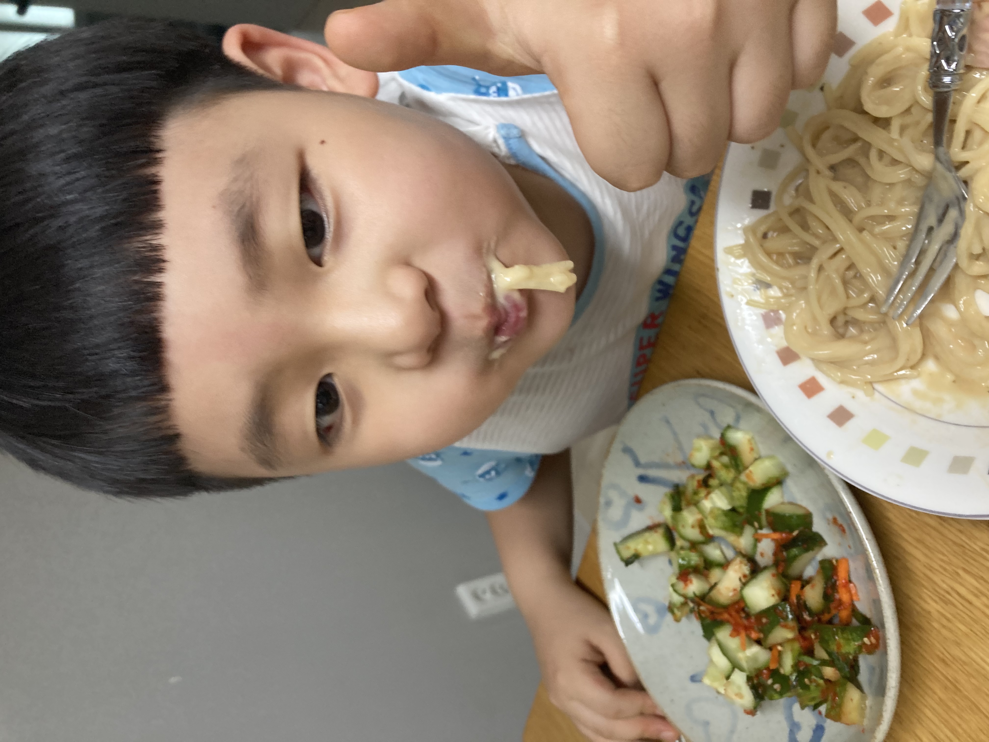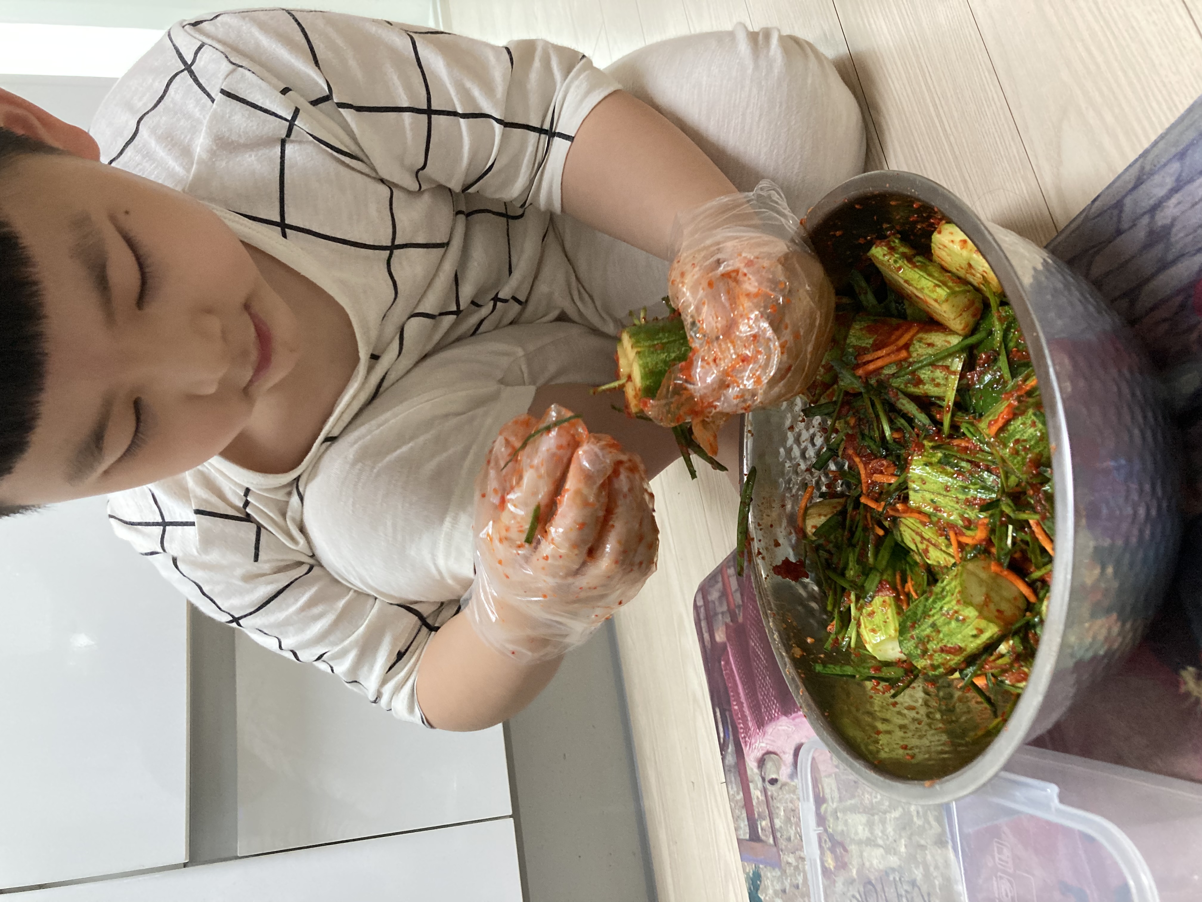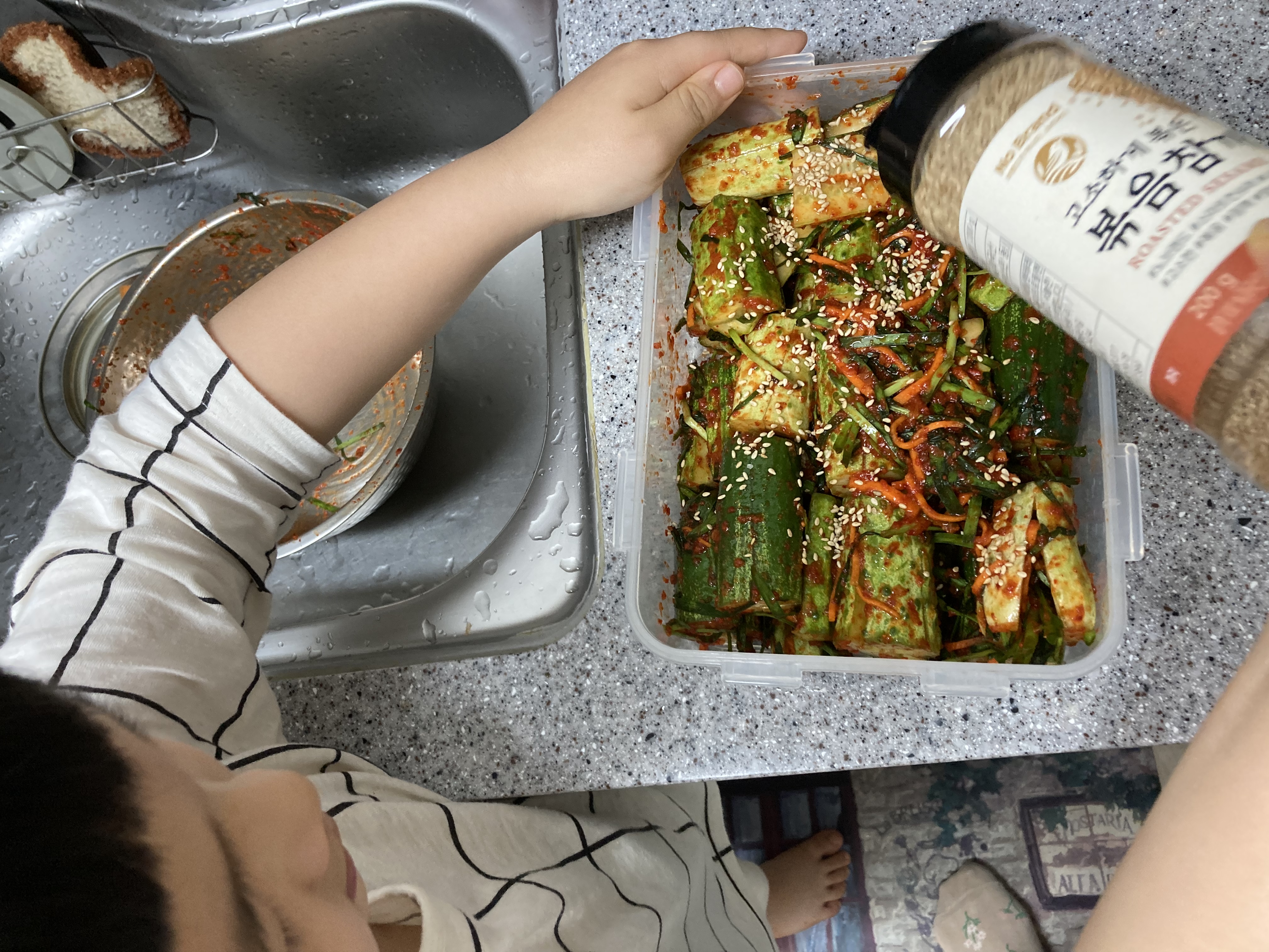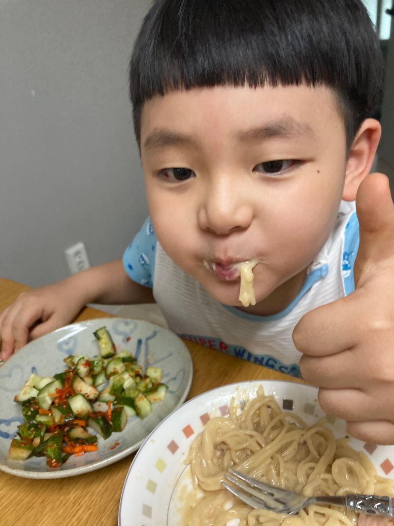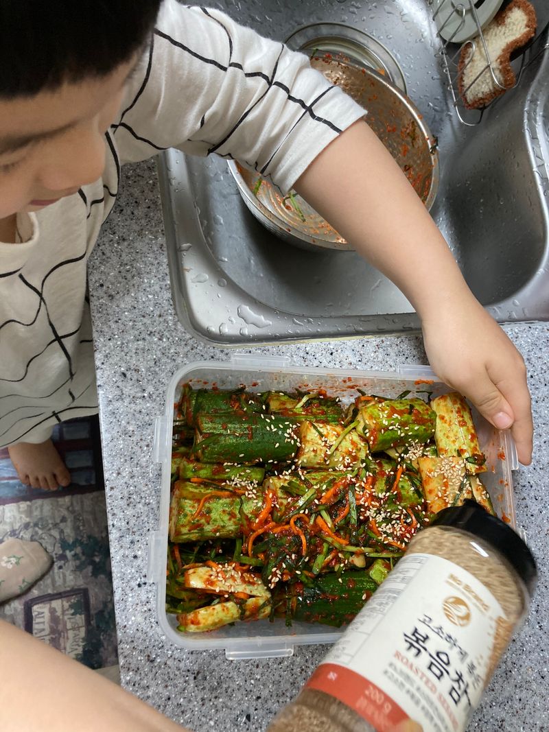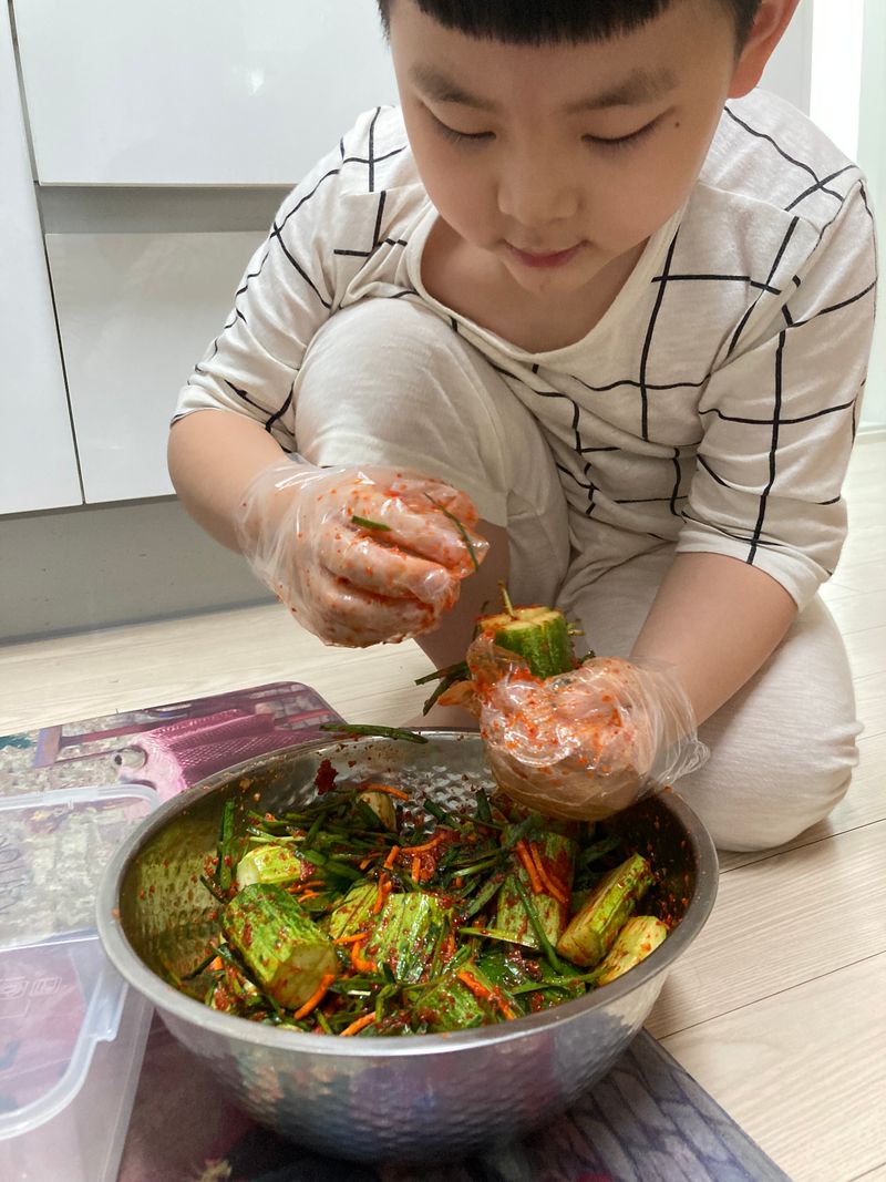주말마다 만나는 아빠를 위해! 꼬마요리사 출동! 제철 맞은 백다다기 오이를 선택! 재료 모두 썰어서 새미네 오이소박이 양념장에 맛있게 버무리니 금방 뚝딱! 음식의 마무리는 깨로 솔솔뿌려 마무리 하면 더 맛있다고 살짝 꼬마요리사가 귀뜸해 주네요! 하루 숙성뒤 파스타와 함께 먹으니 진짜 환상적인 짝궁! 이제 피클대신 오이소박이로 먹겠다는 군요! 주말에 만날 아빠도 완전 반할 맛이겠죠!