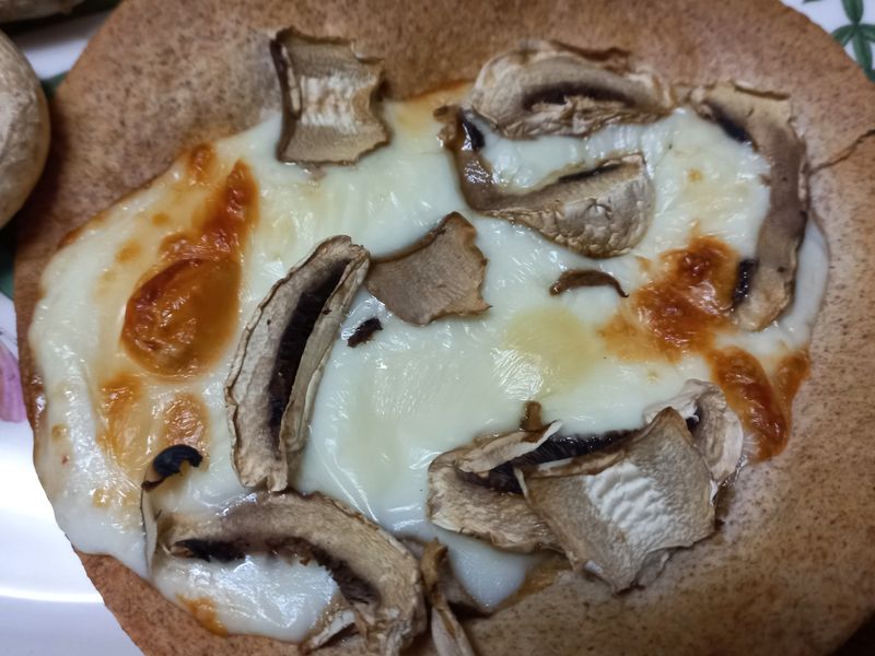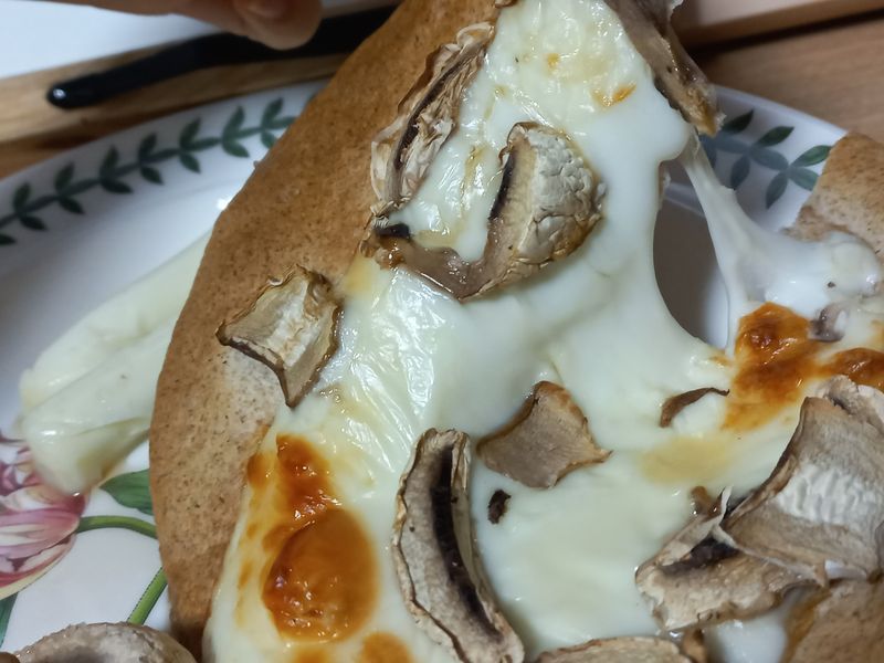 그리고 또띠아한장에다가 스트링 치즈 세개쯤 올리고 양송이 한개 썰어서 에프에 돌려주고요? 요것도 치즈가 노릇노릇해지면 꺼내세요. 또띠아가 확 탈 수도 있어서 너무 높은 온도는 노노~~저는 치즈 노릇해지라고 욕심 부리다가 쬐매 타기 직전이 됬는데 이건 이거 나름으로 또띠아가 바삭하니 과자같아져서 넘 맛있어요 ㅎㅎ