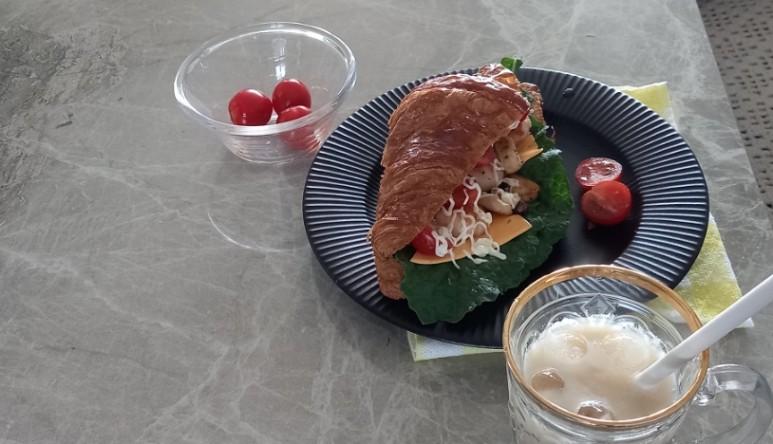 크로와상 샌드위치와 커피 연하게 타서 함께