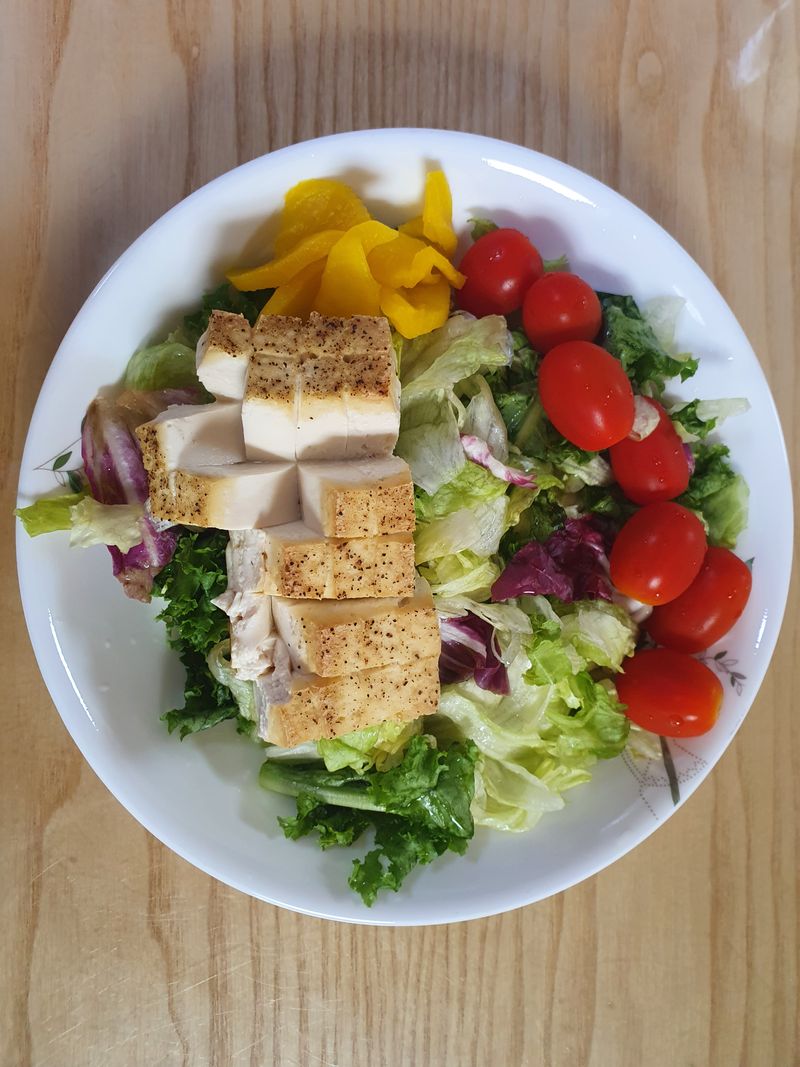 다이어트 중인 나를 위해 건강하고 맛있는 두부스테이크 샐러드 만들었어요! 두부를 칼로 밑에 살짝 남기고 칼집내고 소금 후추로 간을 한 후 에프에 돌렸어요 겉바속촉이 아주 맛있었네요~~♡