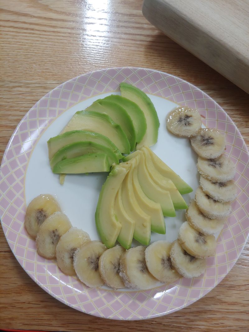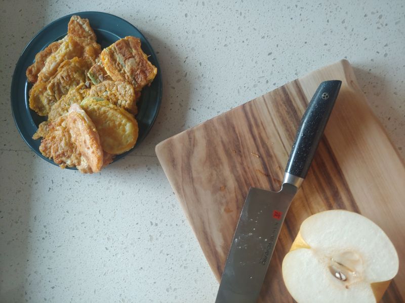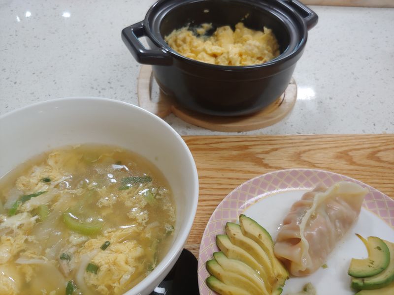 식은 전이랑 아침에 먹을 배 깎다가 바나나랑 아보카도도 썰어놓고🍌🥑 만두국으로 🎑따스한 추석 한상차림 간장 한 숟갈 휙 저어주고 만두 퐁당 들어가고🥟 한 김 끓고 나서 계란 풀어서 두르면 완성🥚 보름달처럼 둥근 계란찜으로 마무리🌕