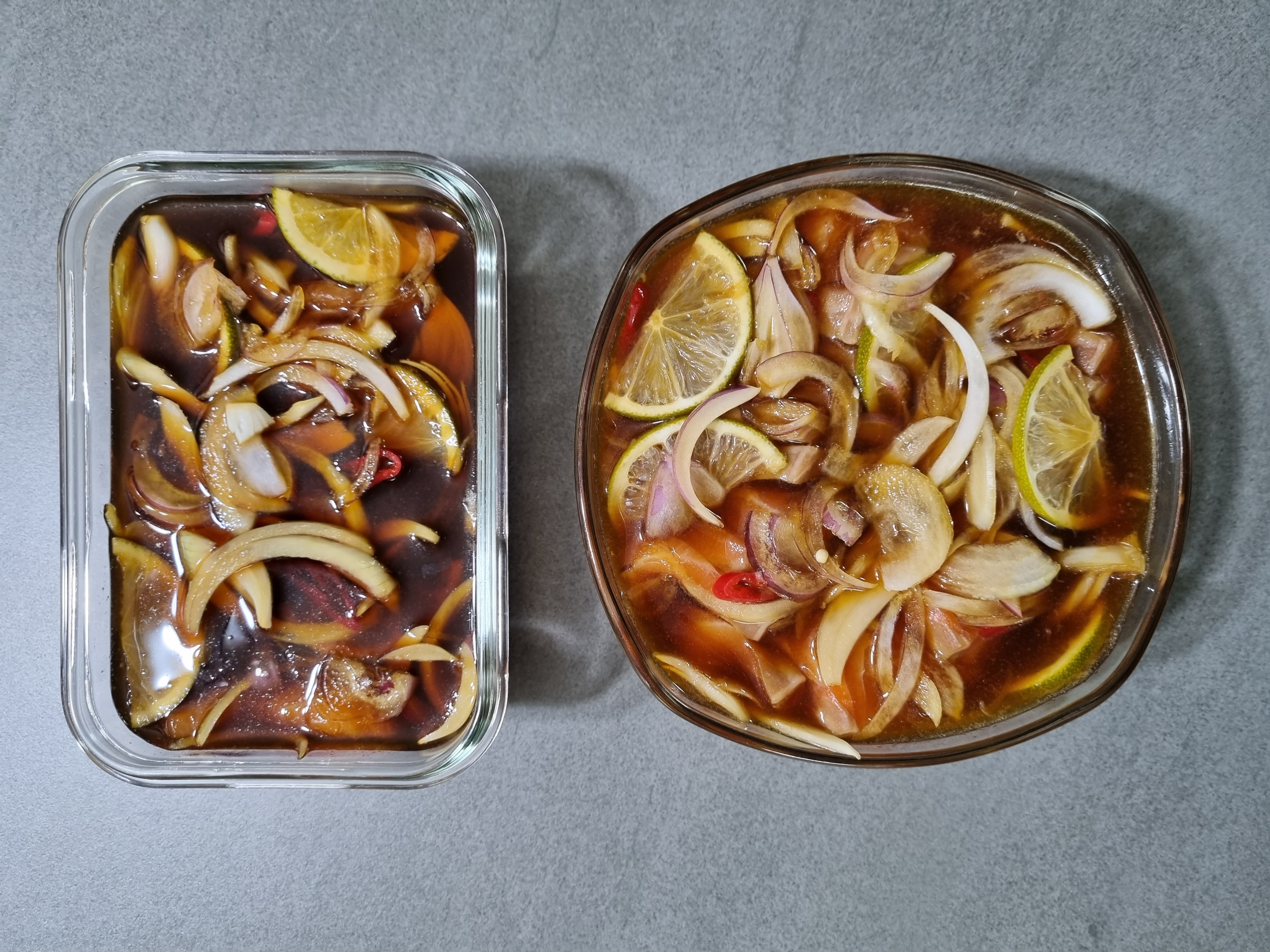연어를 손질해서 슬라이스 한 후 열탕소독한 유리그릇에 연어, 양파, 레몬 순서로 켜켜이 쌓아 둡니다.