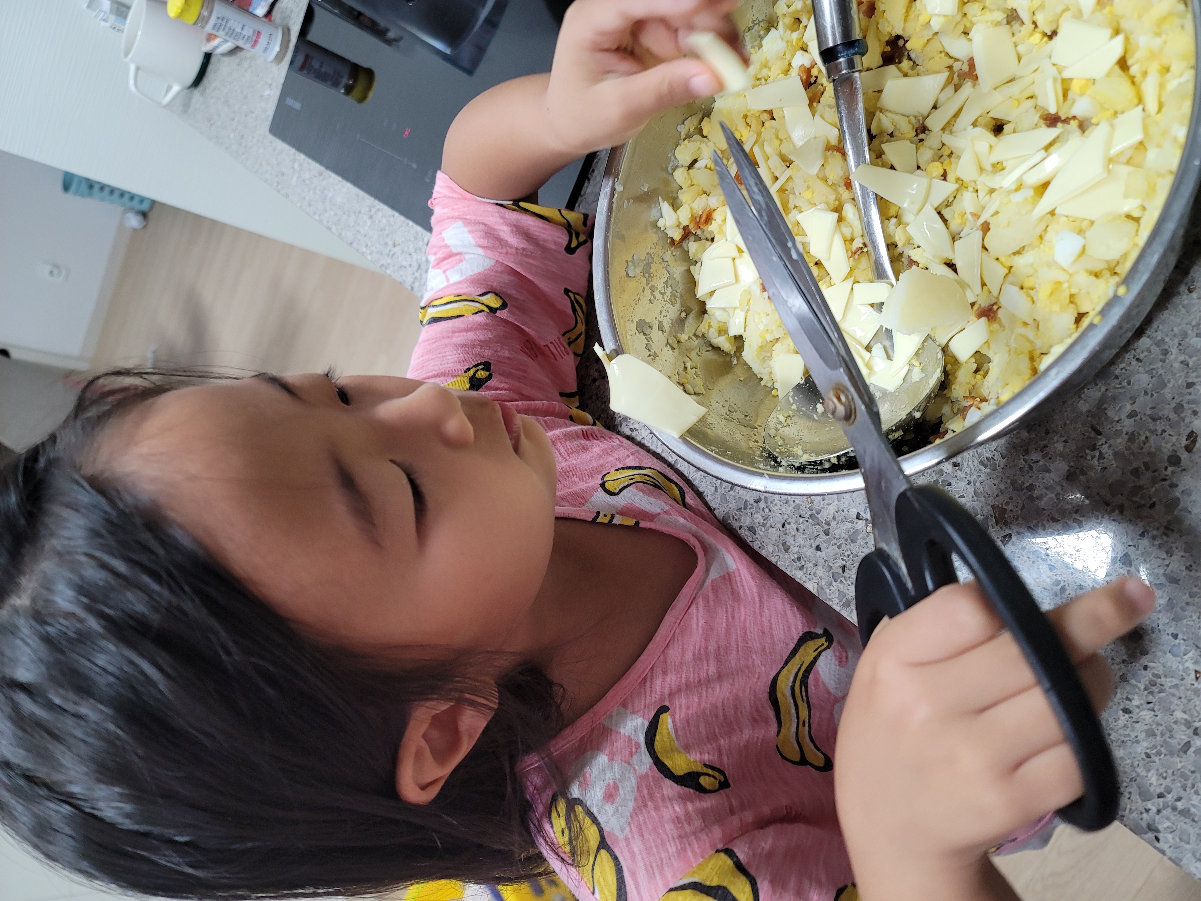 야채와 계란 듬뿍 넣어서 맛있는 요리를 완성해요. 계란과 야채는 이제 내가 손질할 수 있다구! 내가 만든 요리 더 맛있게 먹어야지!