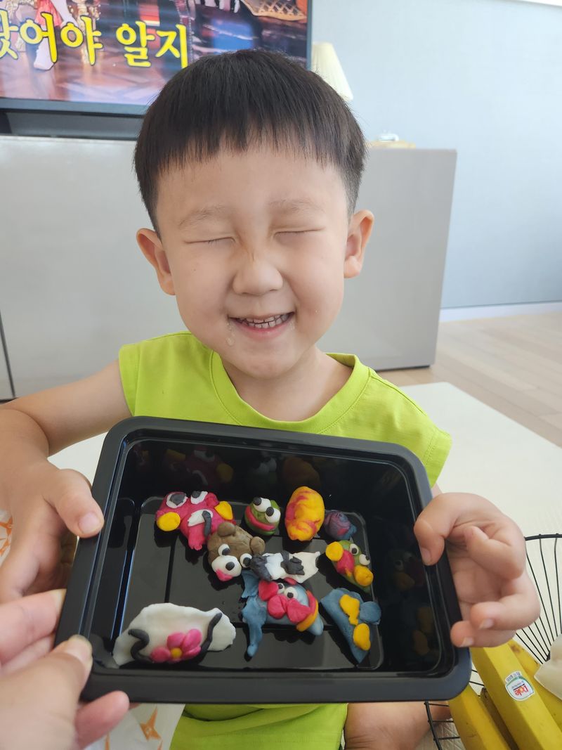 즐겁게 놀이하듯 송편을 만들어보았어요! 아직 5살이라 서툴지만, 몬스터송편이라며 즐겁게만들고 너무나도 맛있게 먹었네요!