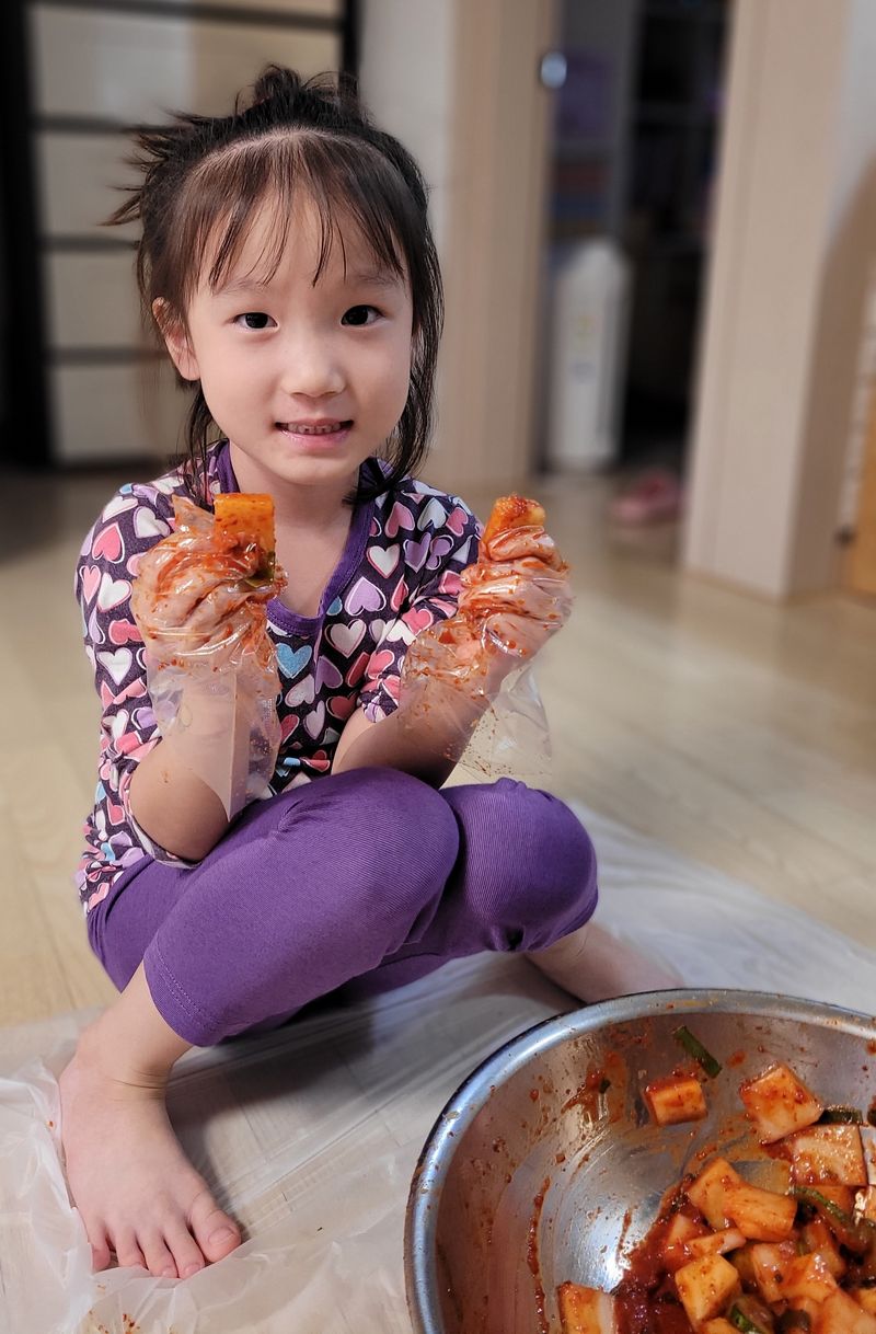 무도 직접 네모랗게 자르고, 작은 손으로 열심히 양념도 버무려서 만든 깍두기!