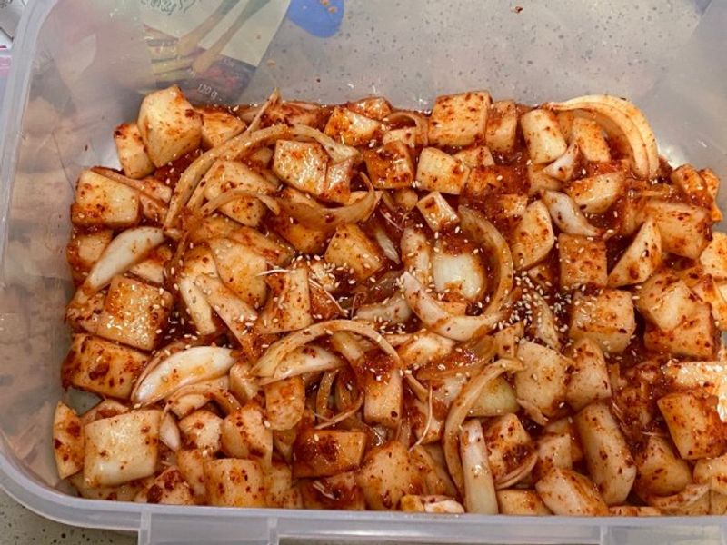코로나에 걸리신뒤 몸이 더 약해지신 할아버지 할머니가 걱정되서 이것저것 오늘도 새미네부엌 소스를 이용해서 반찬도 하구 김치도 담가봣어요 초보 새댁이지만 할아버지가 드시고 기운차리시면 좋겟어요 사랑을 담아 깍두기를 담가봣어요 모든 코로나 환자분들 다들 힘내세요
