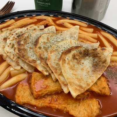 감바스떡볶이 너무 간단해서 캠핑가서도 해먹기 좋답니다 올리브유에 편마늘을 볶고 새우를 넣어 볶다가 후추 페퍼론치노넣고 떡볶이용 떡을 넣고 떡이 익을때까지 볶아주시면 끝!