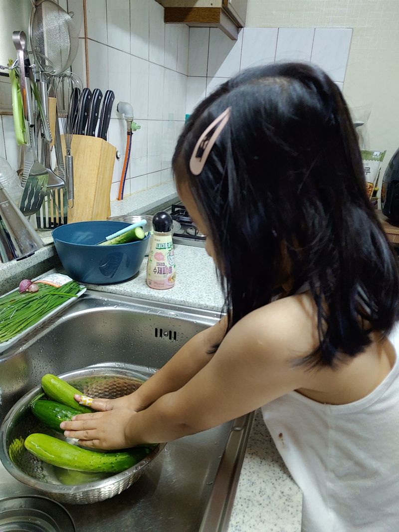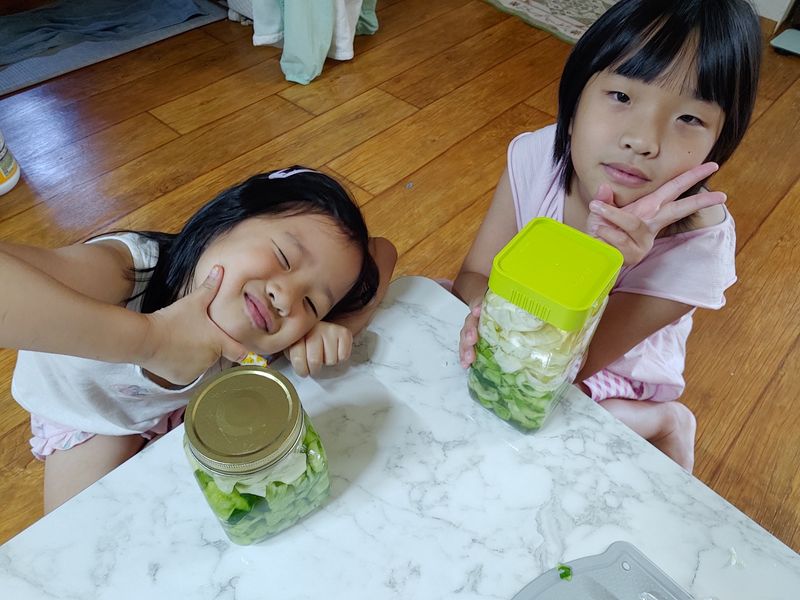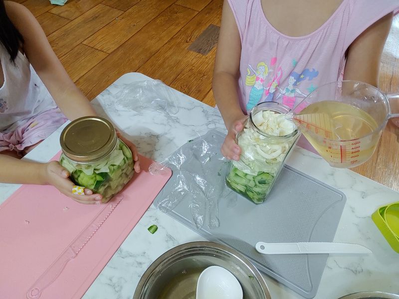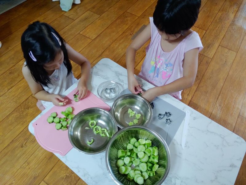 아이들과 함께 오이와 양배추를 씻고, 자르고 모양 커터로 모양을 내고, 새미네부엌 피클 만들기 재료로 함께 피클을 만들면서 오이와 친해지고 아이 스스로 만들면서 편식을 없애고 피클 접해보기 .