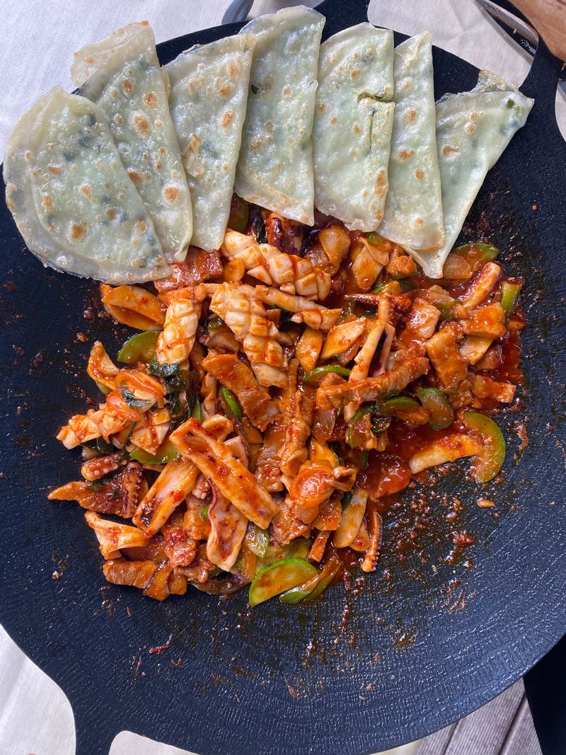 집에서는 요리해먹기 부담스러운 기름기 많고 고추가루 팍팍 튀는 오삼불고기를 마음편하게!! 거기다 납작만두 곁들여 쌈싸먹으면 아주 나이스