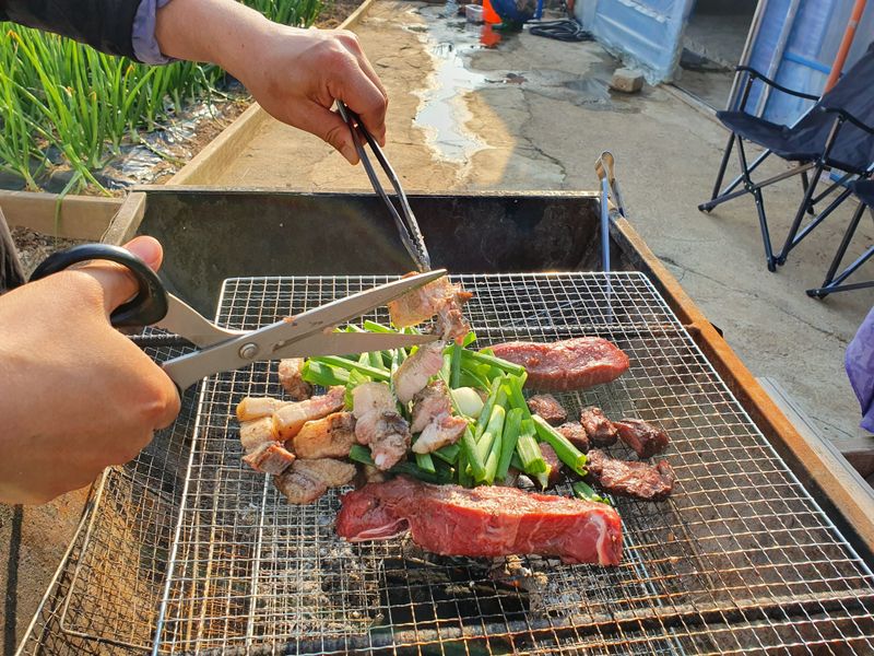 캠핑에 빠질 수 없는 음식! 바로 숯불에 구워먹는 바베큐 입니다. 불맛 가득한 고기 / 해산물 / 야채 구워먹고 마지막에는 라면까지 보글보글 🍜 가장 캠핑스러운 음식이죠 🙂 - 직접 캠핑장에서 찍은 사진입니다.