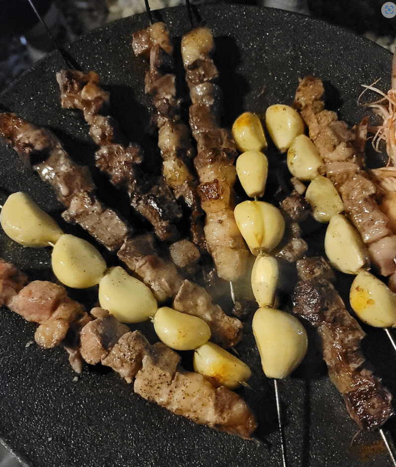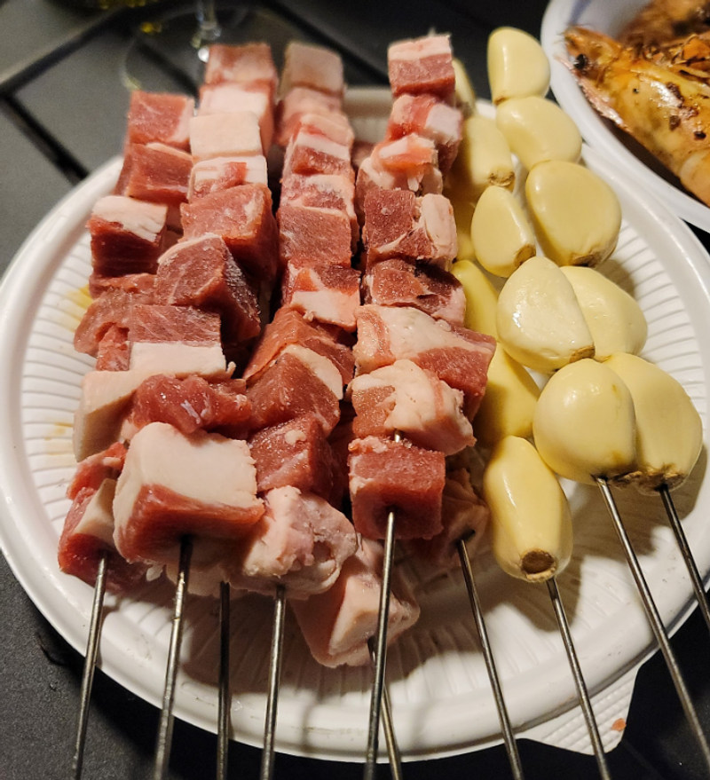 양꼬치 집에서 먹던 양꼬치가 먹고싶어서 캠핑갈때 양꼬치용 고기를 사서 캠핑장에서 꼬치로 직접 꽂았네요 통마늘도 같이 굽굽~ 숯불에 구어도 맛나고 그리들에 구워도 쯔란 찍어먹으니 양꼬치집에서 먹던 맛이납니다^^