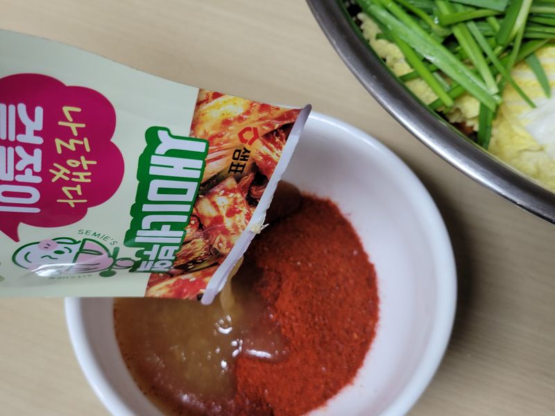 배추에 배 가득넣고 부추랑 당근으로