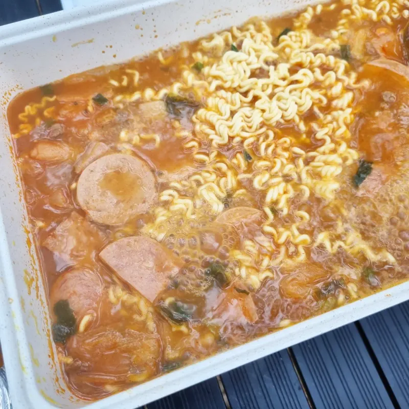 치즈부대찌개는 소세지, 햄 다 들어있어서 그냥 끓이기만 되고, 저는 라면 반개 더 넣어 끓였어요. 국물맛이 진짜 깊고 진해요.