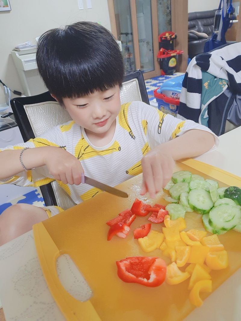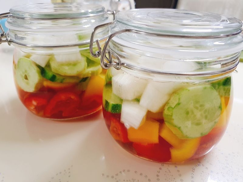 형형색색의 야채를 썰고 예쁜 유리병에 담아