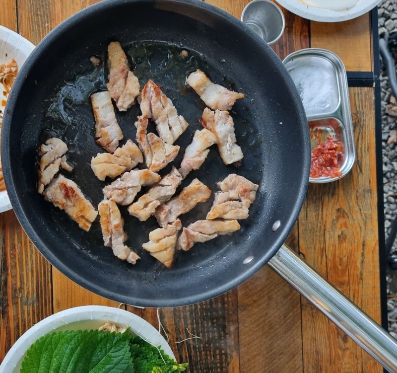 캠핑을 시작한지 얼마 안된 우리집은 일단 심플하게 시작했어요 야외에서 먹으니 정말 꿀맛입니다