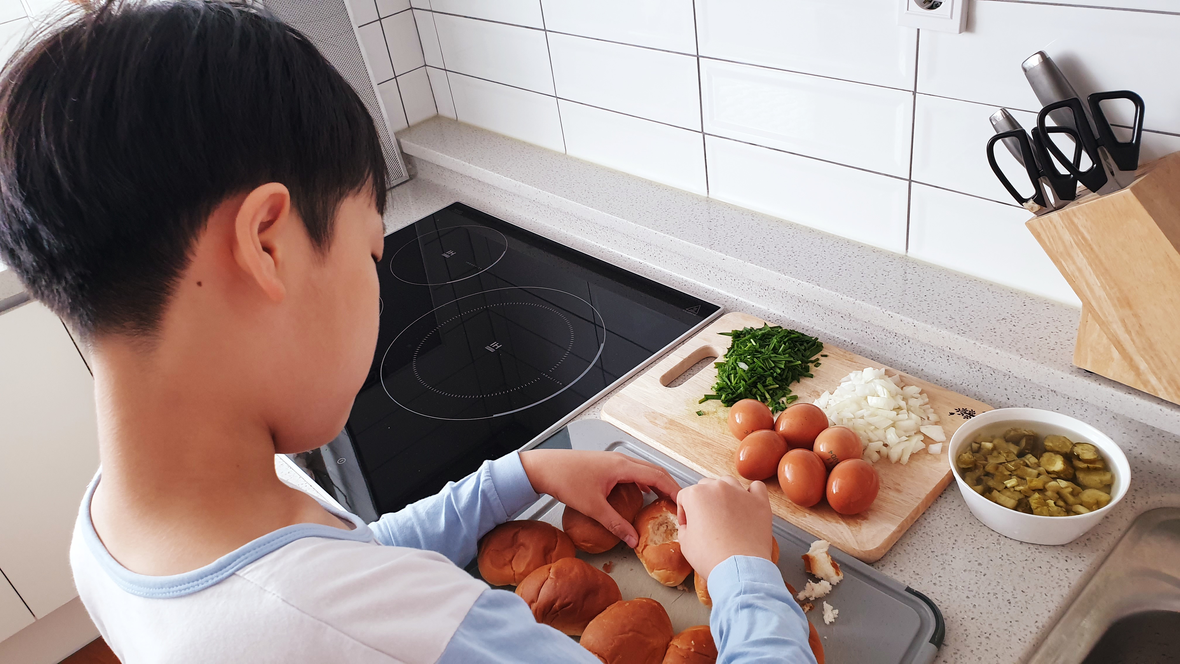 아이랑 함께 재료 다지고, 계란깨고, 가장 재밌던 모닝빵 손으로 파내기 ㅎㅎ 그리고 소금톡톡^^