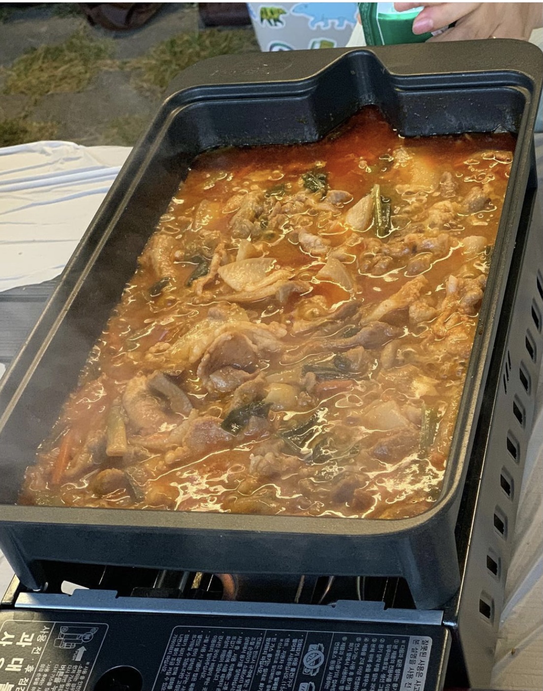 신랑이 맛있는 음식 해준다며 요리를 준비해갔어요ㅎㅎ 수비드머신으로 아롱사태를 13시간설정 후 아롱사태가 재탄생했어요. 캠핑장에 가서 사골곰탕넣고, 부추랑 팽이버섯, 아롱사태를 넣고 끓이니 너무나 맛있는 아롱사태전골이 되었어요. 저녁 메인메뉴로 딱이었어요. 부드러워서 7살, 10살 딸 모두 잘 먹었어요. 친구네식구도 맛있다며 잘 먹었지요^^ 아롱사태전골을 다 먹고, 2차메뉴는 친구가 사온 부대찌개입니다. 초등학생인 제딸과 친구 딸 너무 잘 먹네요ㅎㅎ 마지막은 7살 딸과 동갑내가 친구아들이 먹을 수 있는 크림커리떡볶이 준비해봤어요. 역시 캠핑가선 맛있는 음식 좋은 사람들과 즐기는게 쵝오지요^^