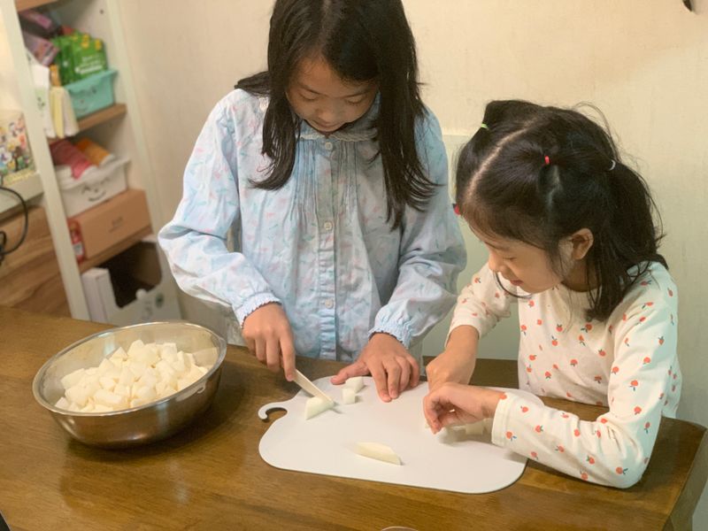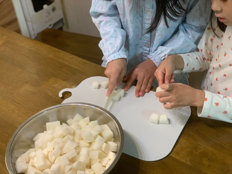 재료와 친해지기 위해 무를 빵칼로 깍둑썰기로 썰었습니다. 쓱싹쓱싹! 잘 썰었어요ㅎㅎ