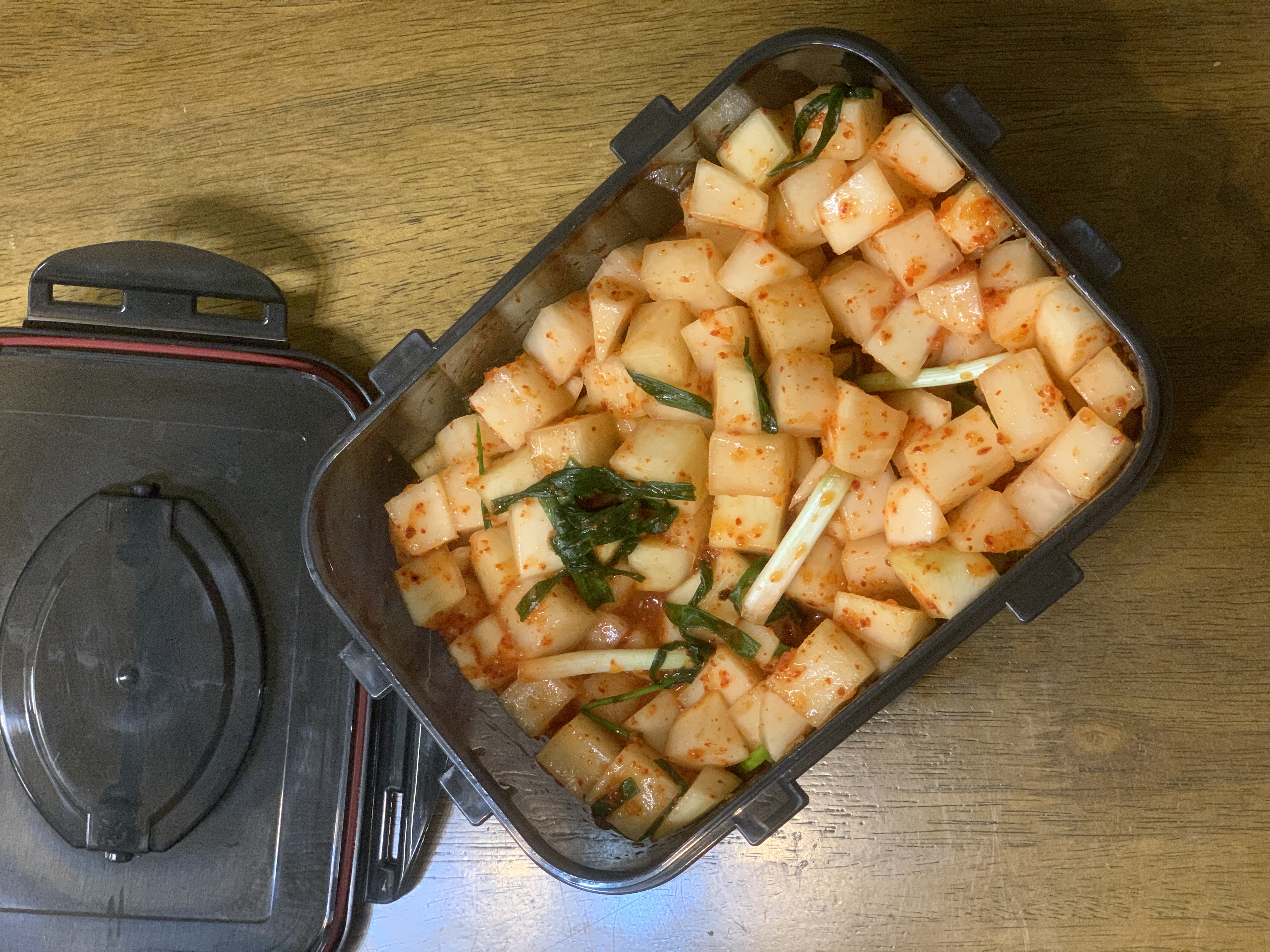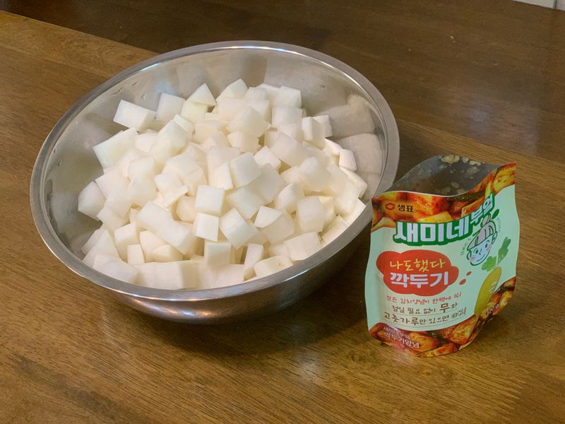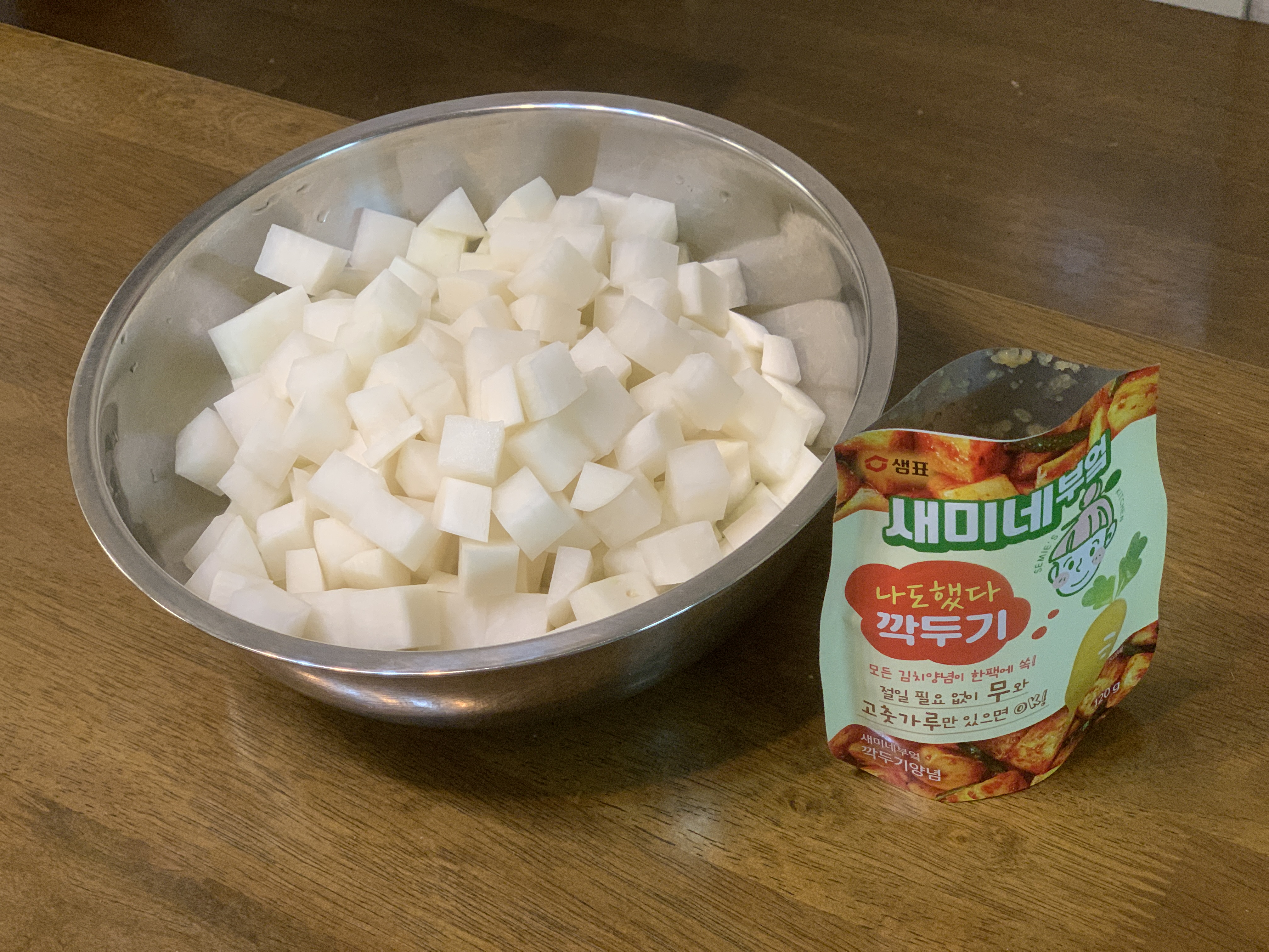 1kg의 무를 다 자른후, "나도했다깍두기양념"에 1시간 재웠어요.