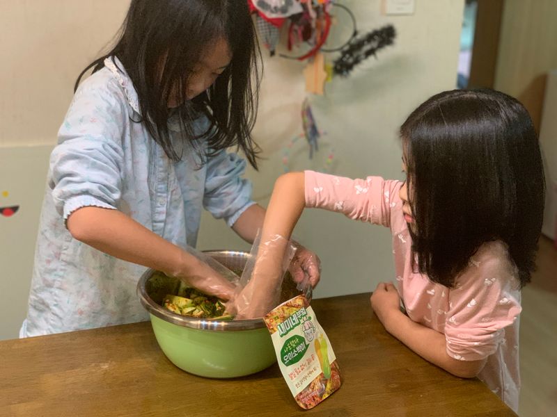 잘 절여진 오이에 고춧가루넣고, 부추와 섞어주었어요. 요리참여하는걸 좋아하는 저희 아이들은 놀이공원보다 더더 요리가 즐겁다고 하네요ㅎㅎ 함께요리챌린지 너무 너무 좋아요^^