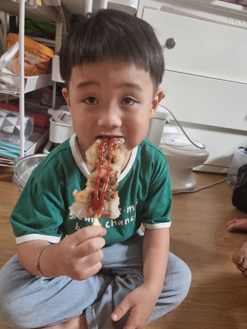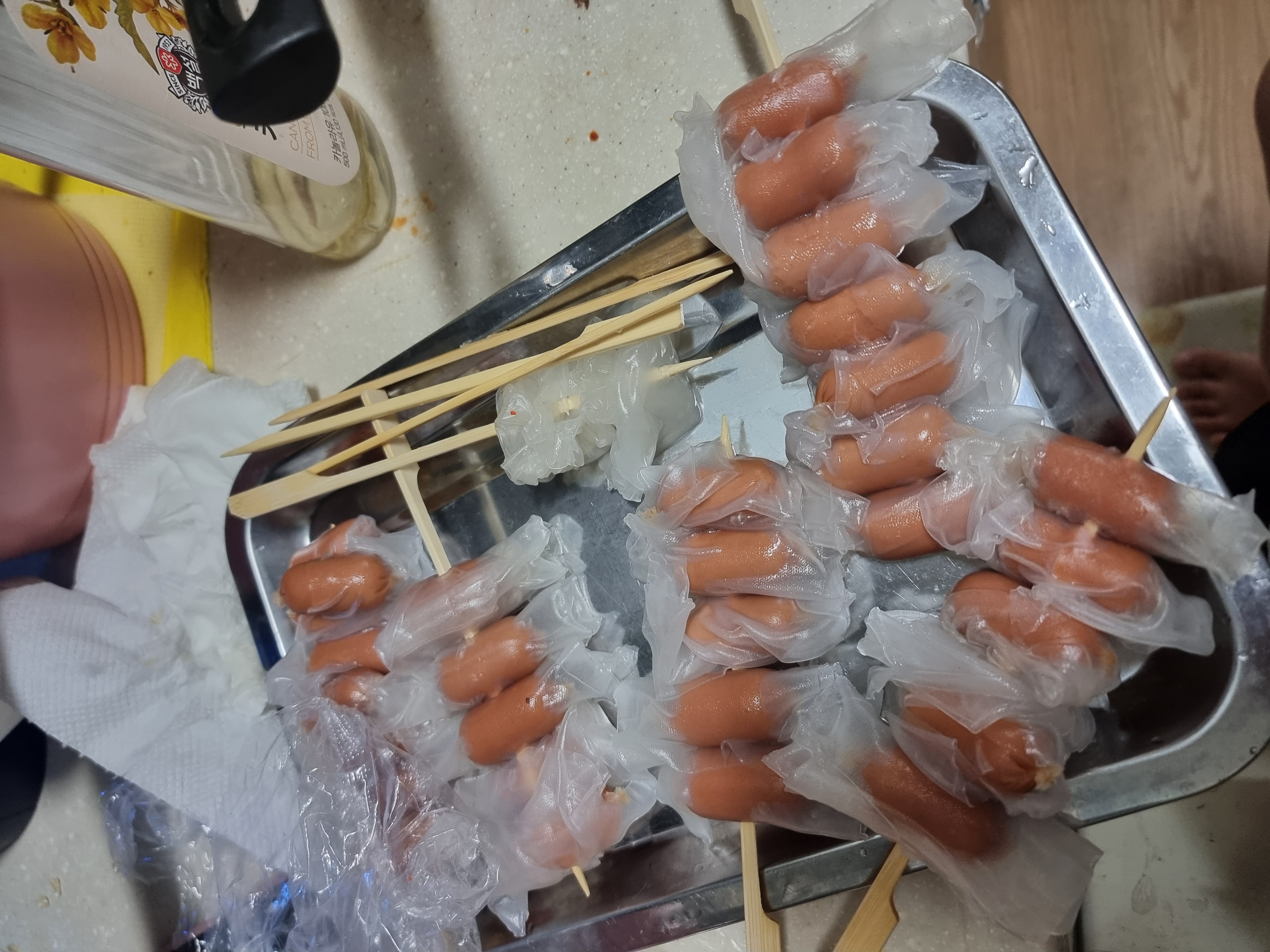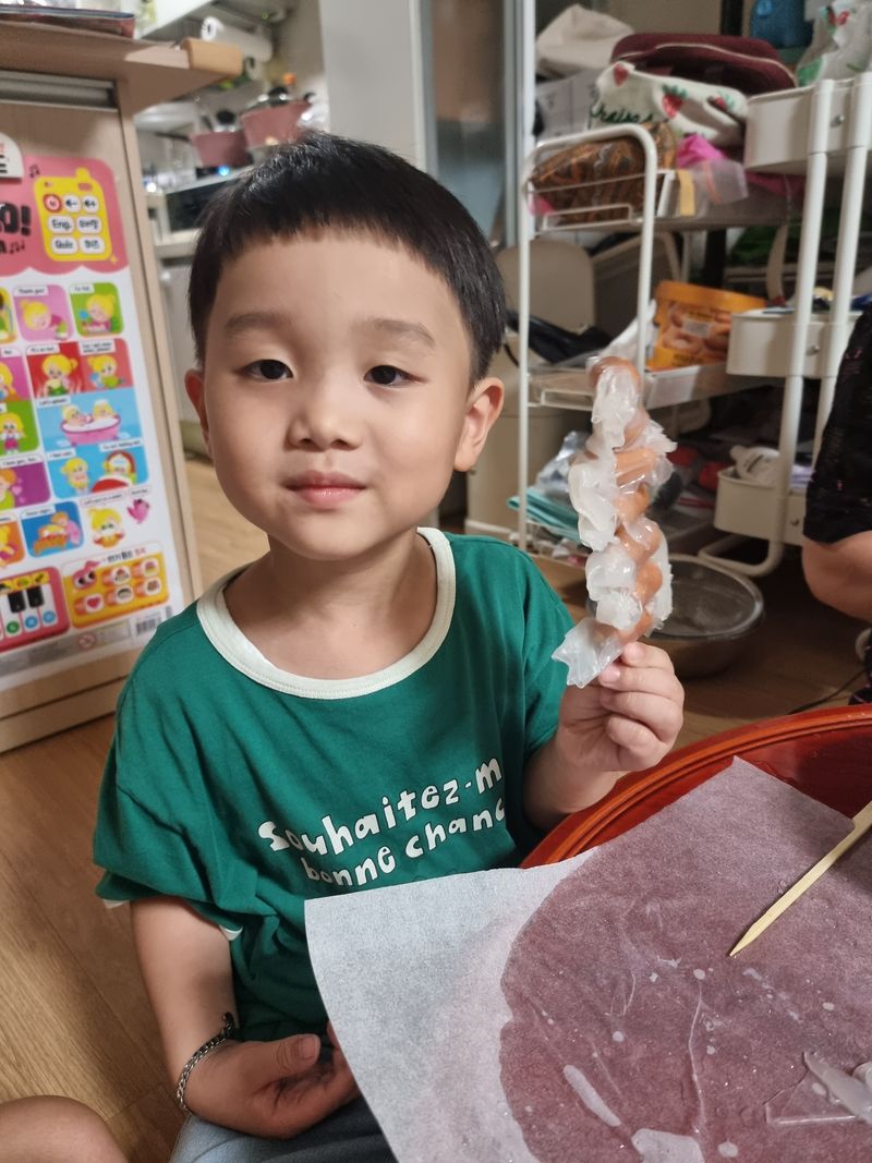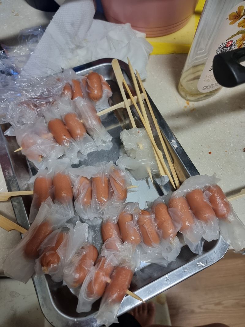 미끌미끌 말랑말랑해서 기분이 좋다고 말하는 애기들. 열심히 소세지에 말아서 꼬치 완성이네요