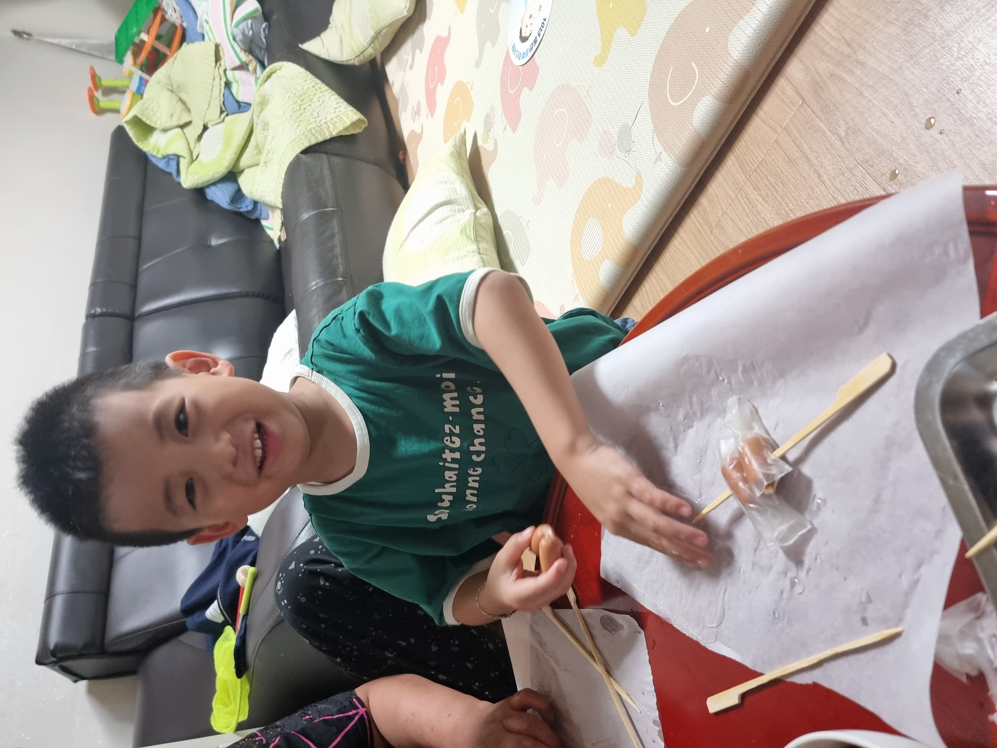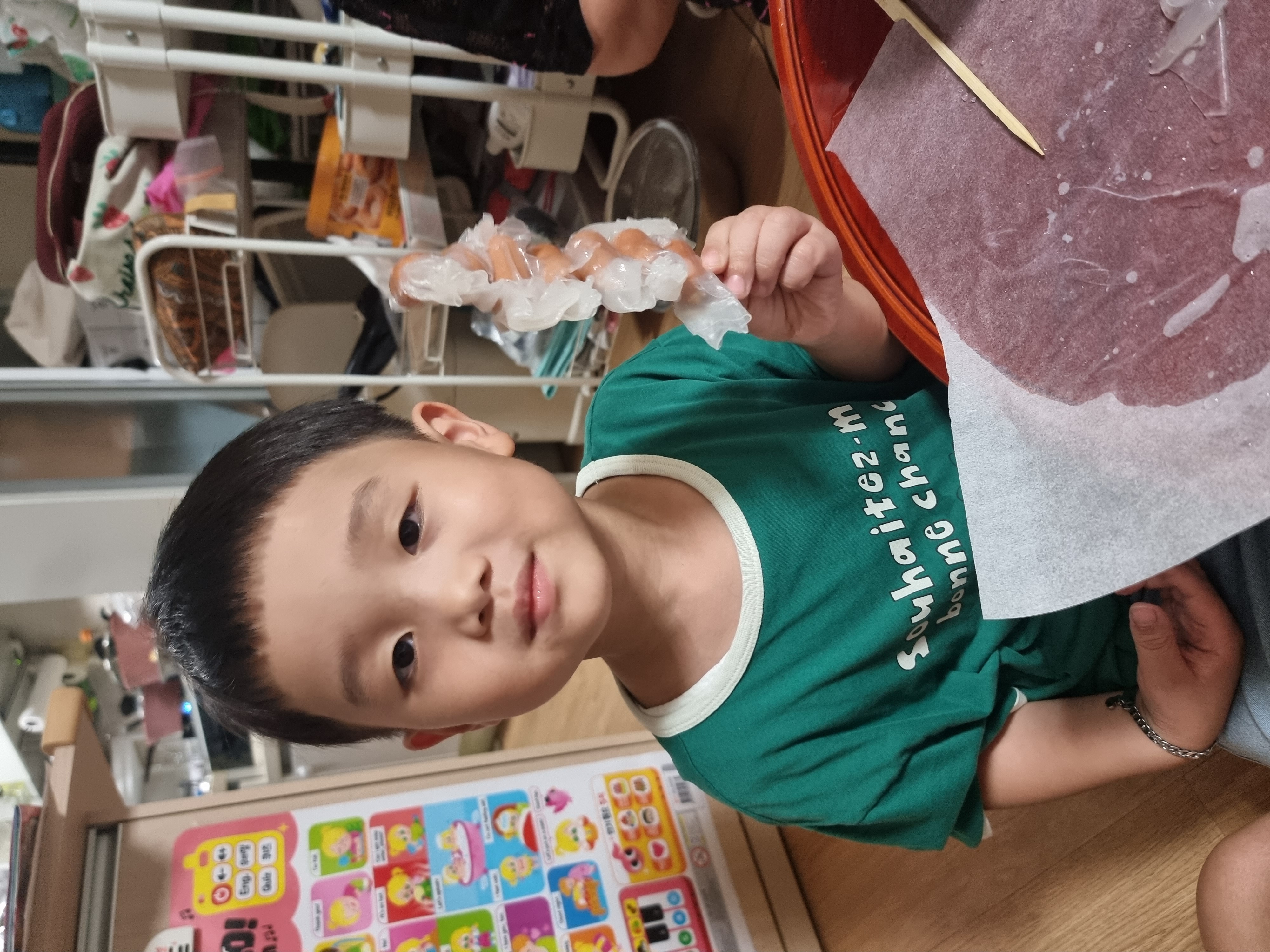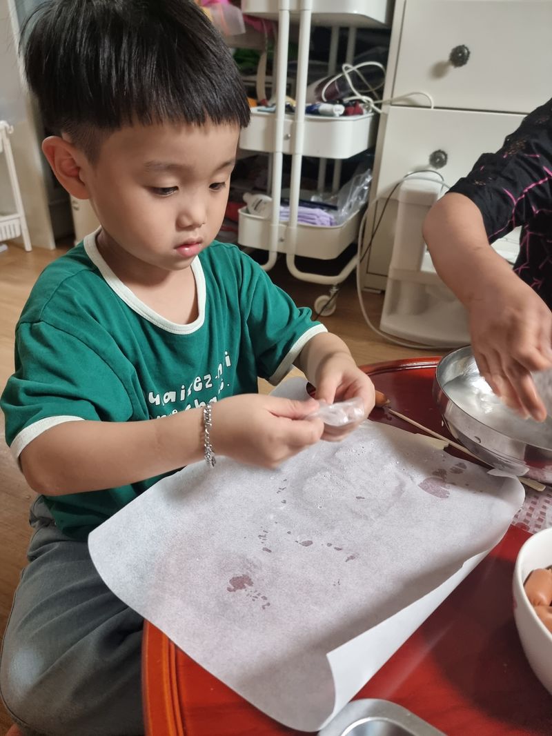 미끌미끌 말랑말랑해서 기분이 좋다고 말하는 애기들. 열심히 소세지에 말아서 꼬치 완성이네요