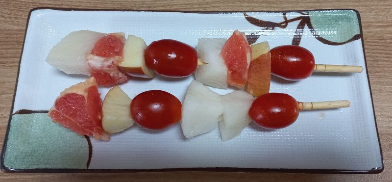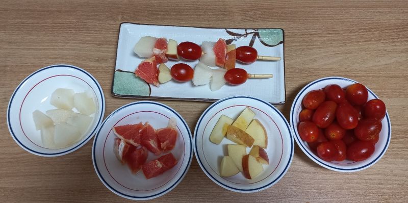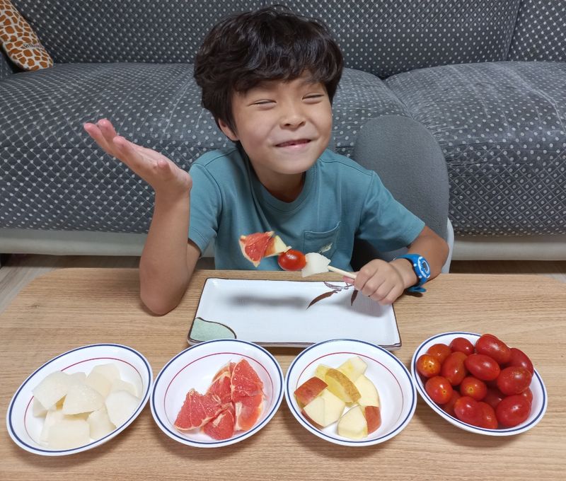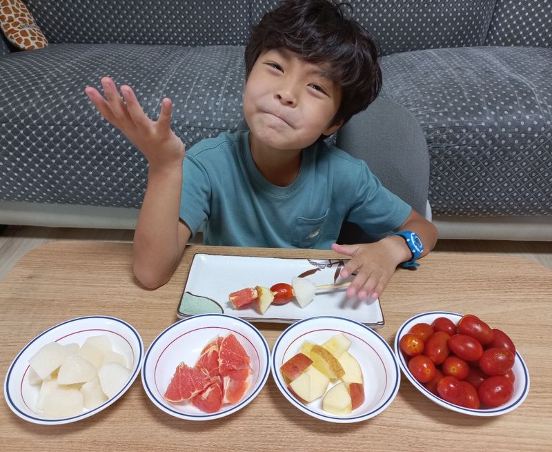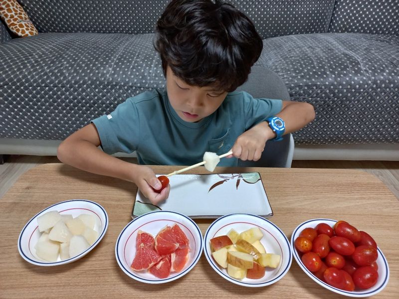 미션 1. 재료야놀자 과일은 늘 먹던 배만 좋아하는 둘째아이에게 여러가지 과일은주어 꼬치 미션을 해보았더니 즐겁게 하네요~ 배, 사과, 자몽, 방울토마토로 과일꼬치 만들었어요! 중간에 집어 먹는게 더 많긴 했지만 엄마, 형아, 외할아버지와 재밌게 만들어보았습니다~^^