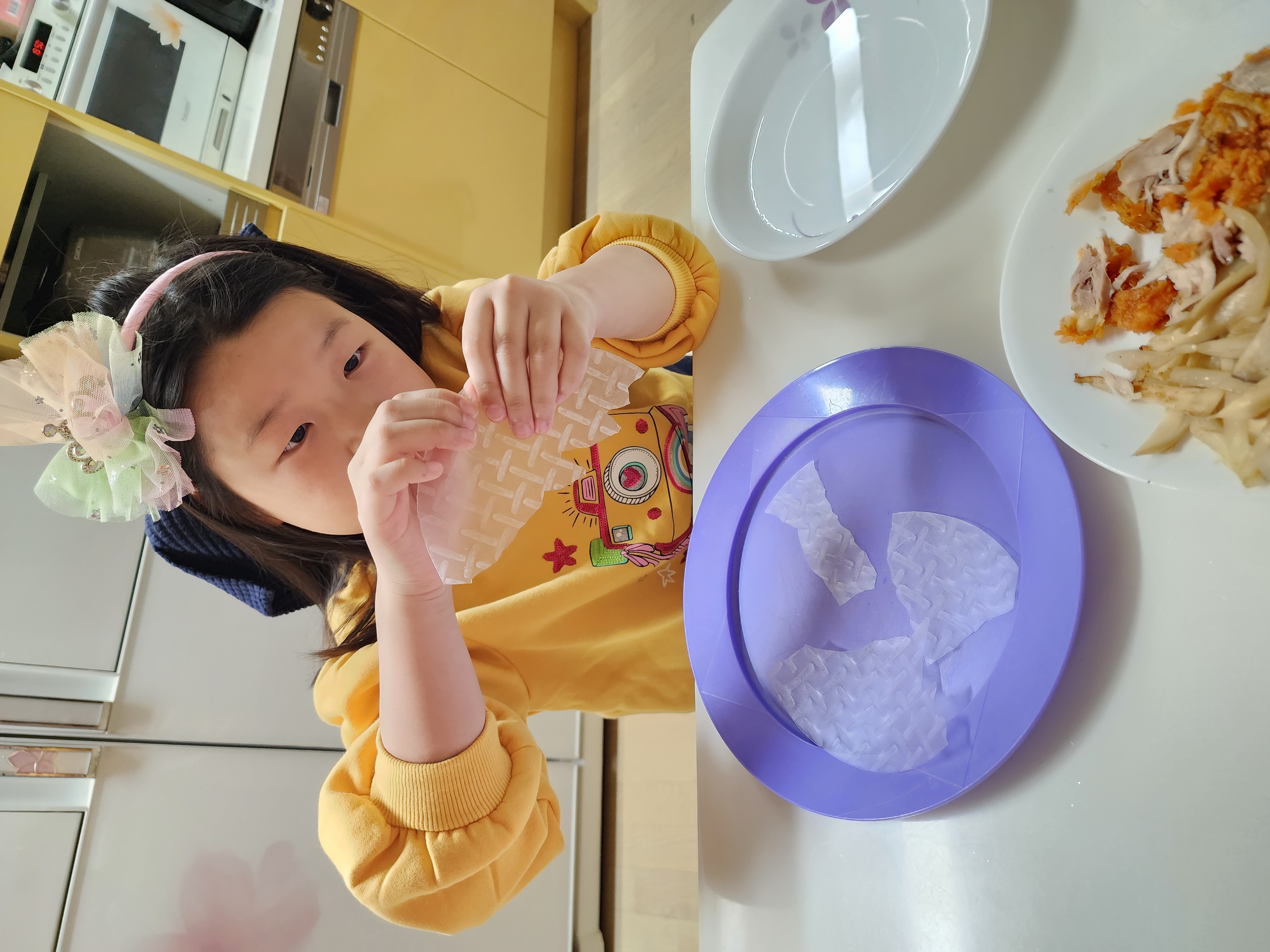아이가 양파랑 버섯을 싫어하는데 맛있게 먹을수 있는 요리가 뭘까 고민하다 남은 치킨도 활용할겸 월남쌈처럼 라이스페이퍼에 싸서 먹으면 잘 먹을거같아서 요리해봤어요~