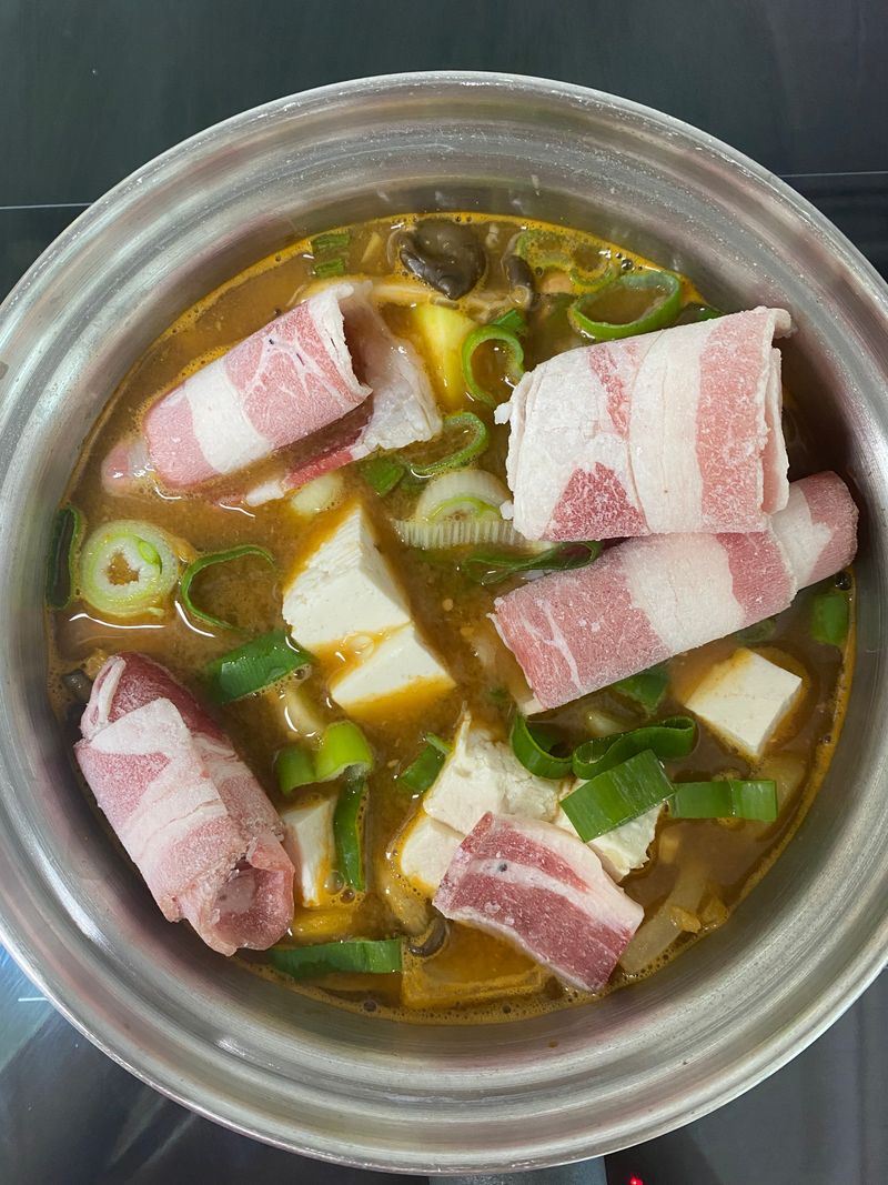 그리곤 물 넣고 준비된 야채,두부&우삽겹넣고 끓여줬어요.