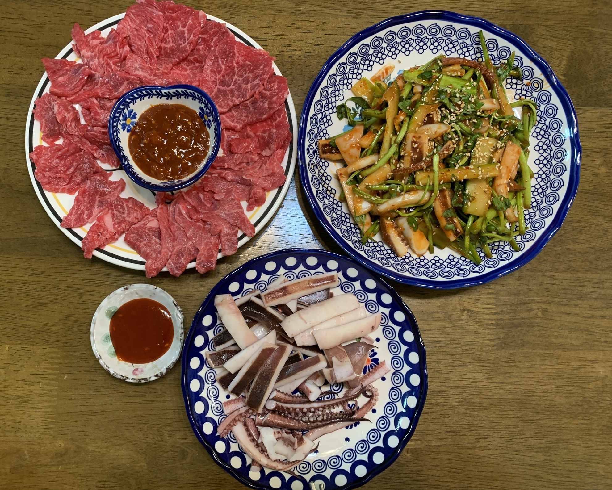 신선한 오징어를 손질 후 오이와 미나리를 넣고 샘표 비빔장으로 맛있게 비볐습니다.