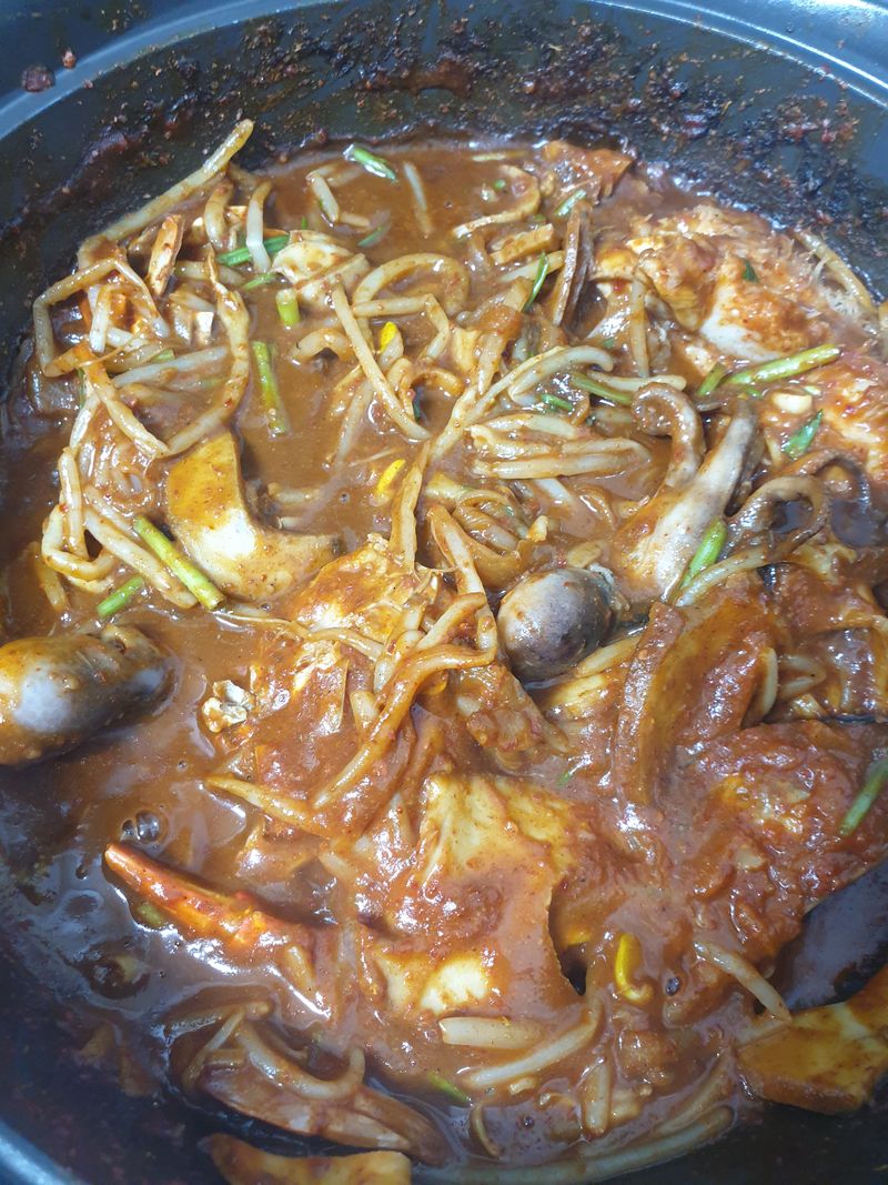 우리가족이 모두좋아하는 해물찜 만들어봤어요 이해물찜에는사실 간편한비밀이있답니다 엄마가 해물찜 맛있게하는 비법을아셔서 엄마가 양념을보내주셨어요 ㅎㅎㅎ 주꾸미 홍합 소라 아구살등 각종 해물과 굵은콩나물넣고 15분간푸욱찌다가 막판에 엄마표양념만넣으면 완성이예요 대박맛입니다 남은양념에 밥까지볶아서 맛나게먹었어용