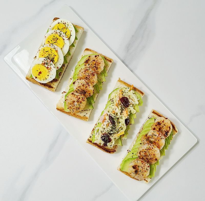 냉동실에 남아있는 식빵으로 오픈샌드위치처럼 만들어봤어요^^ 식빵은 버터에 구워서 반으로 자르고~ 치즈크림 바른후, 아보카도랑 삶은 달걀, 새우, 양배추샐러드 얹으니 예쁘게 완성되네요♡