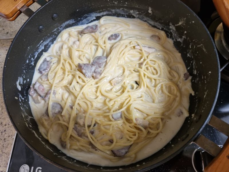 까르보나라 소스와 면, 면수 조금 넣어